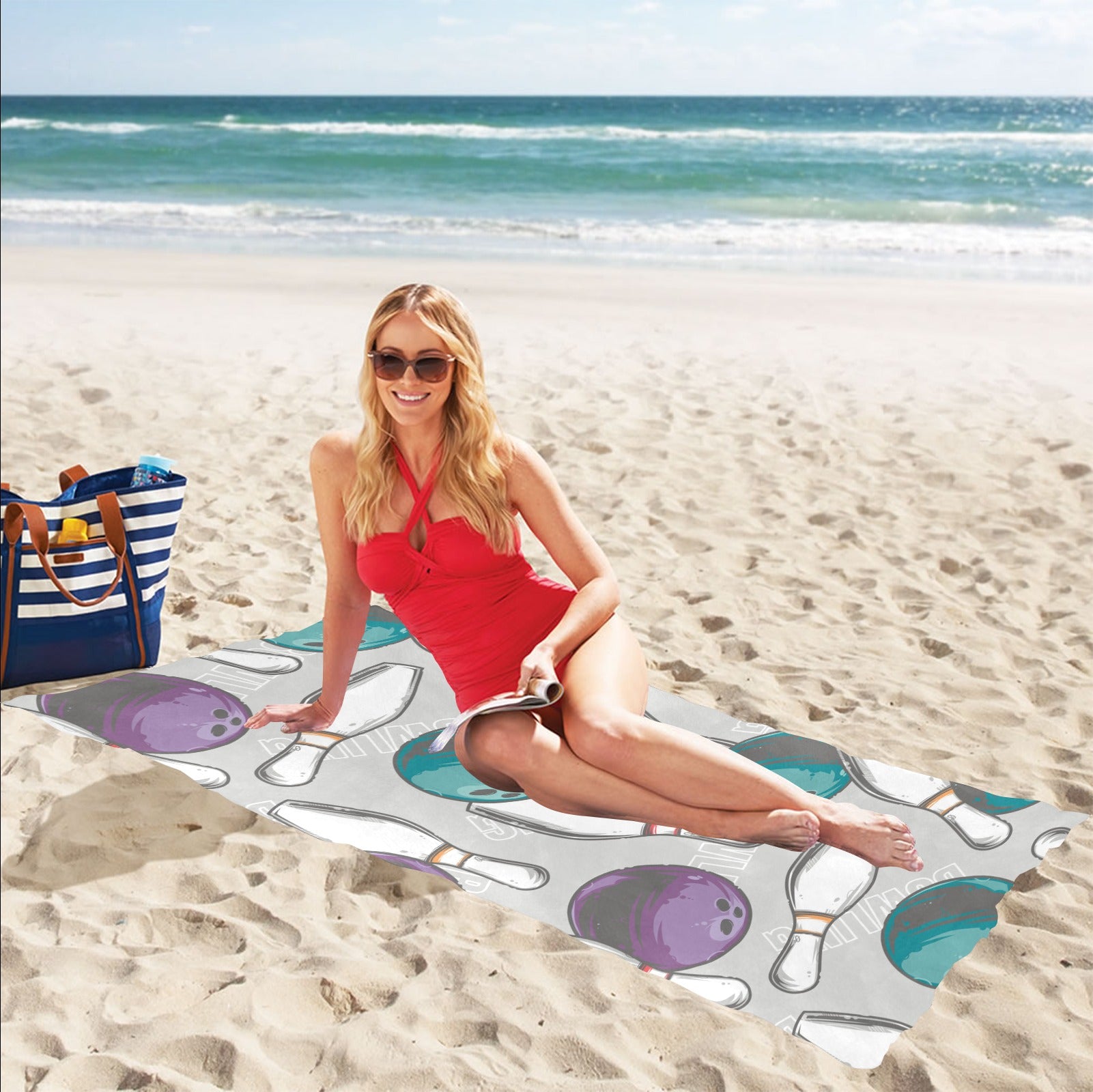 Bowling ball and pin gray background Beach Towel