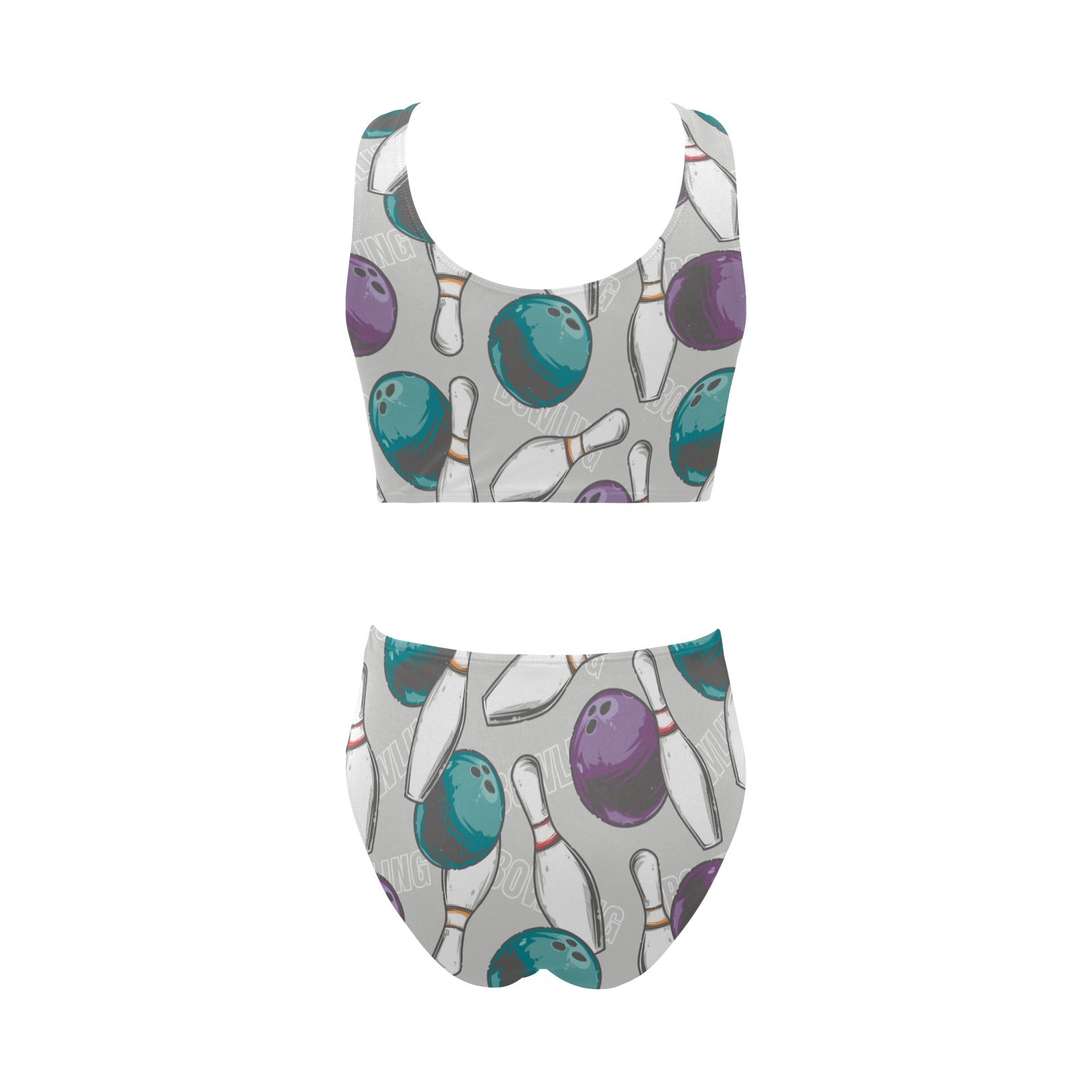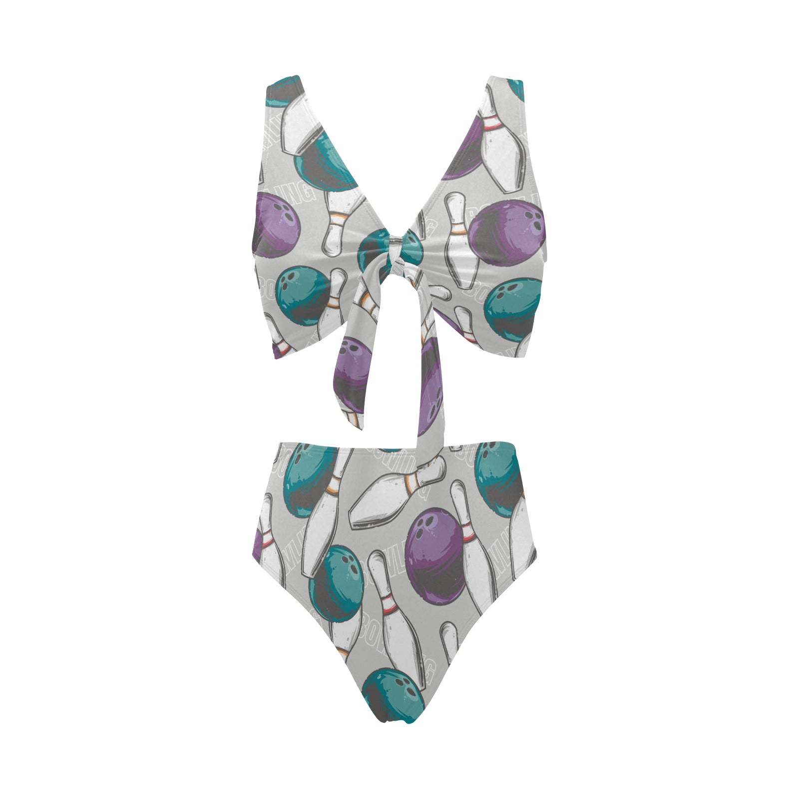 Bowling ball and pin gray background Chest Bowknot High Waisted Bikini Swimsuit