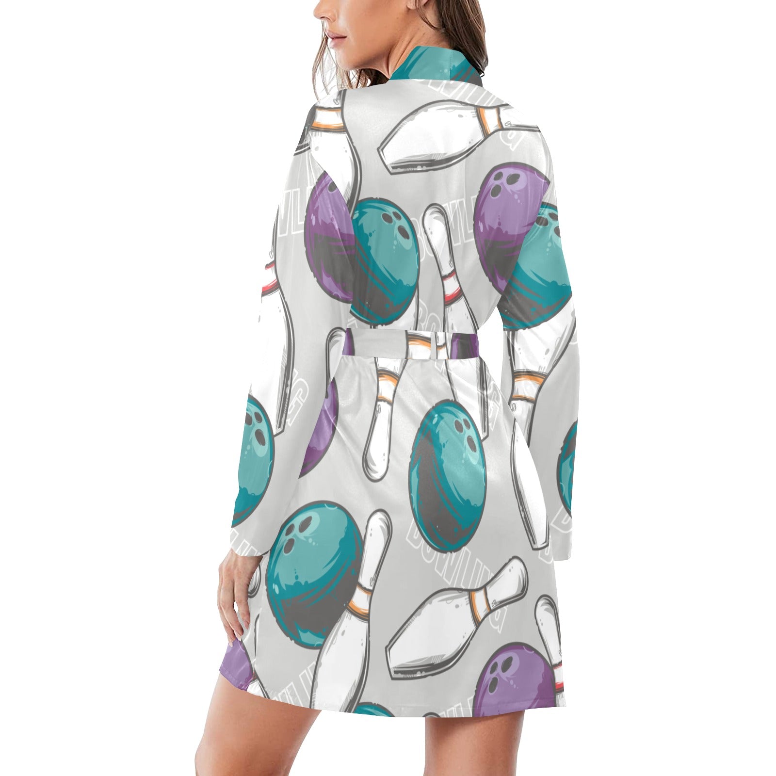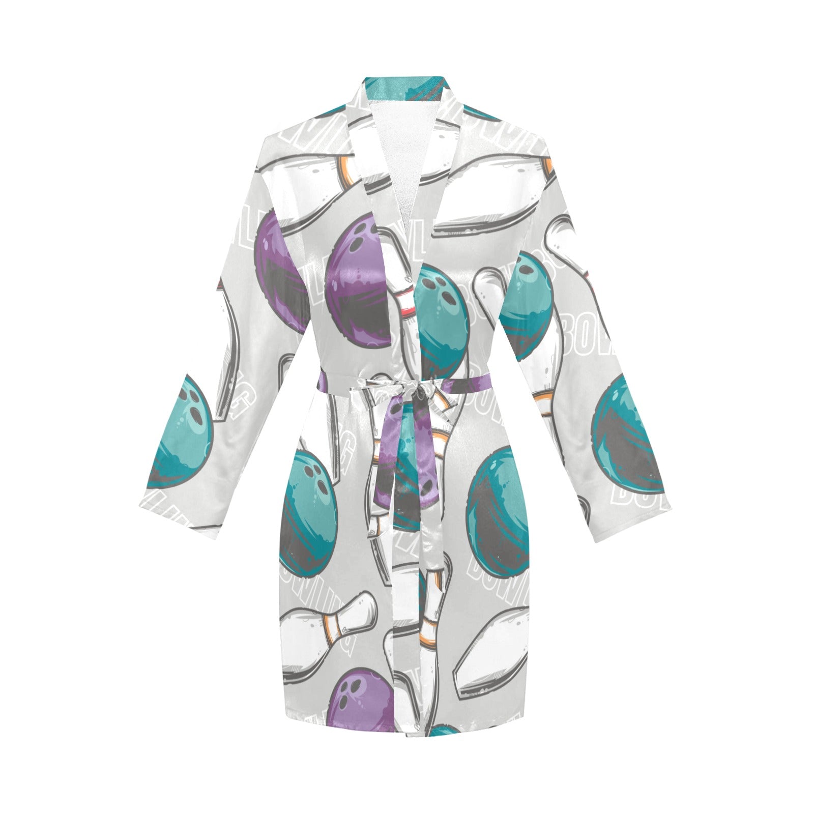 Bowling ball and pin gray background Women's Long Sleeve Belted Night Robe