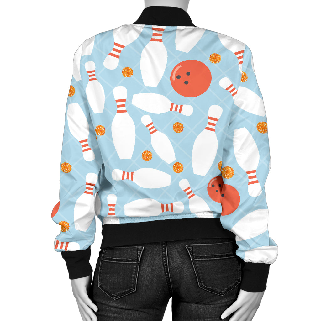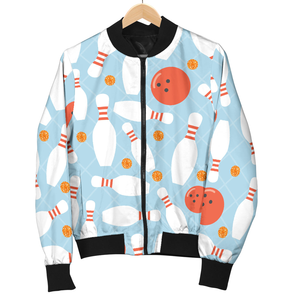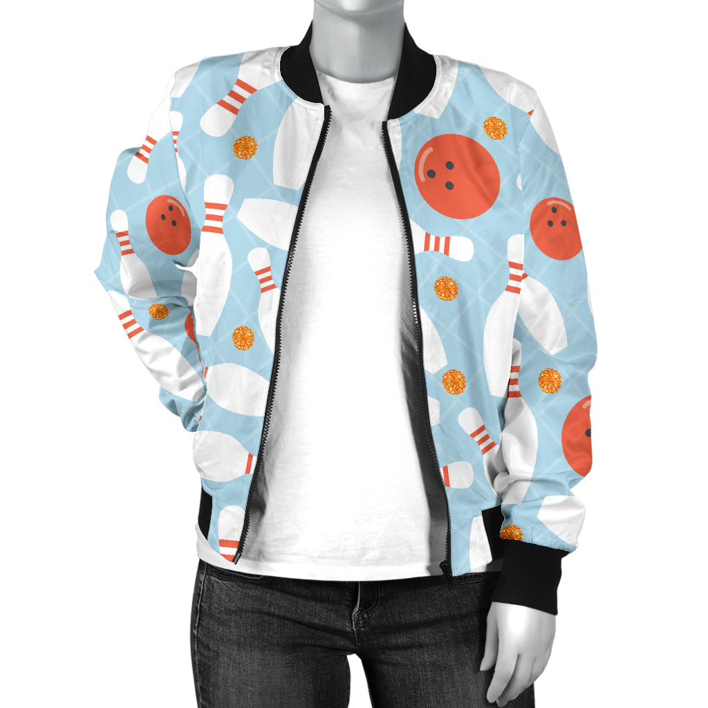 Bowling ball bowling pins blue blackground Women's Bomber Jacket is a uniqued design and limited item. It made to order, hand printed, and sewn with love in our factory.