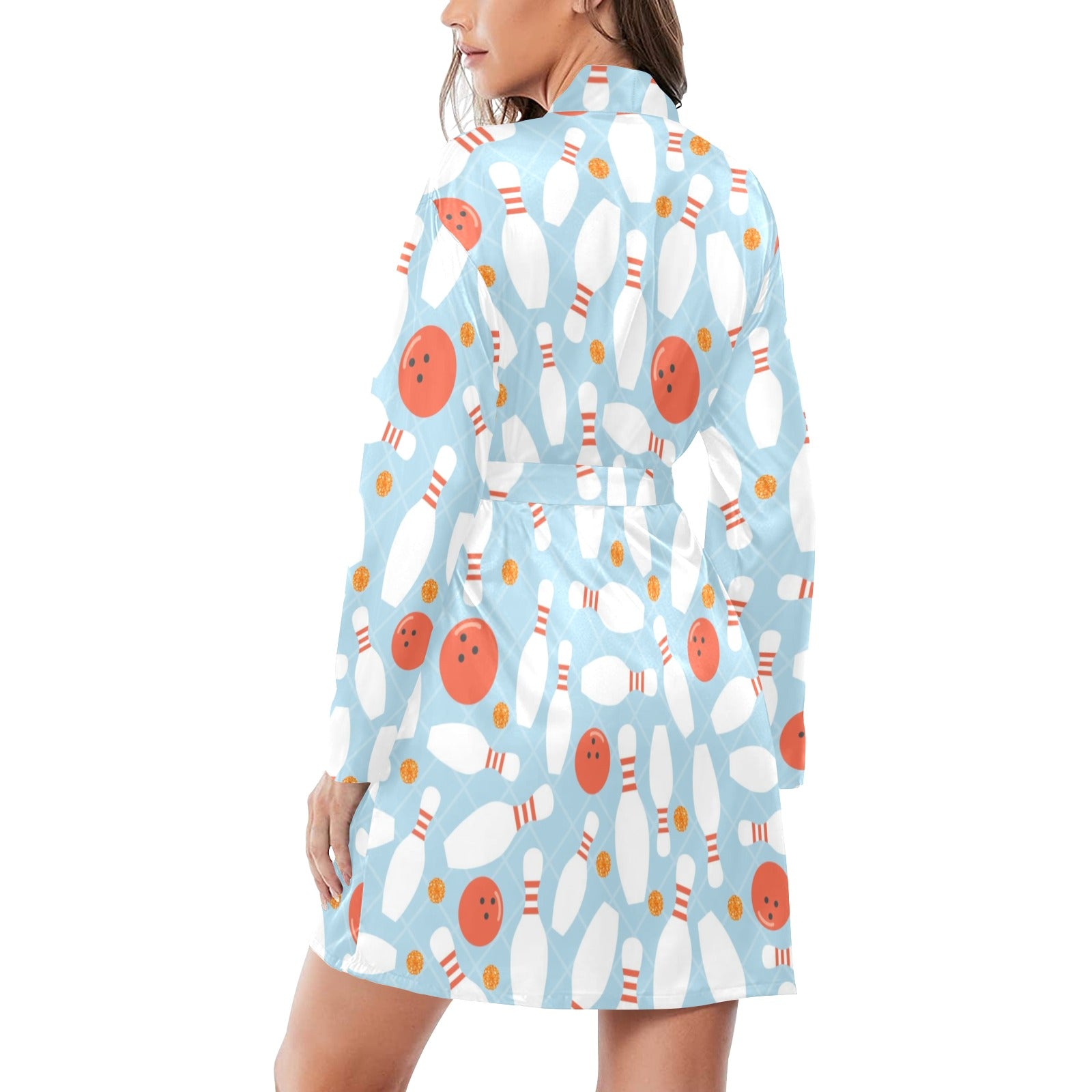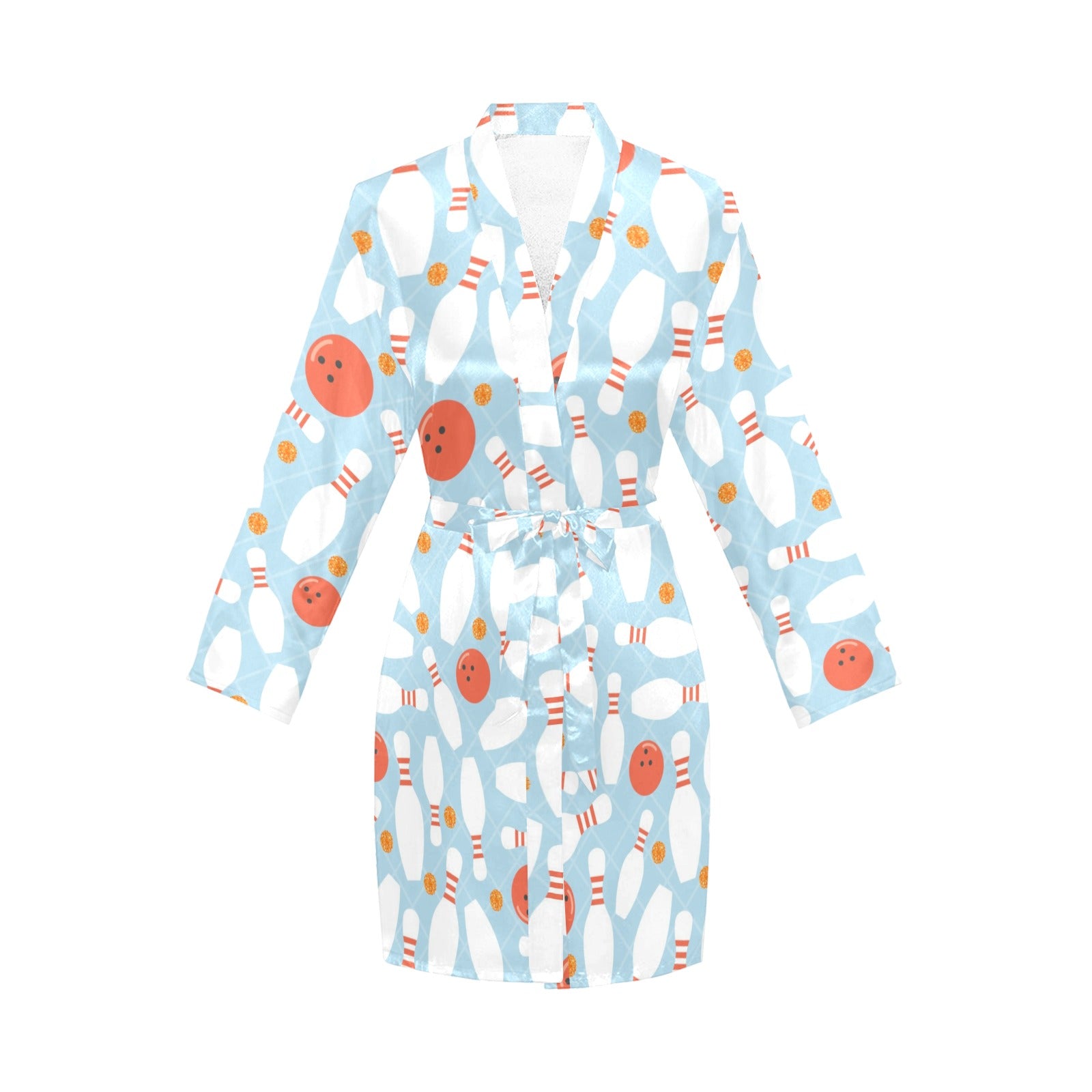 Bowling ball bowling pins blue blackground Women's Long Sleeve Belted Night Robe