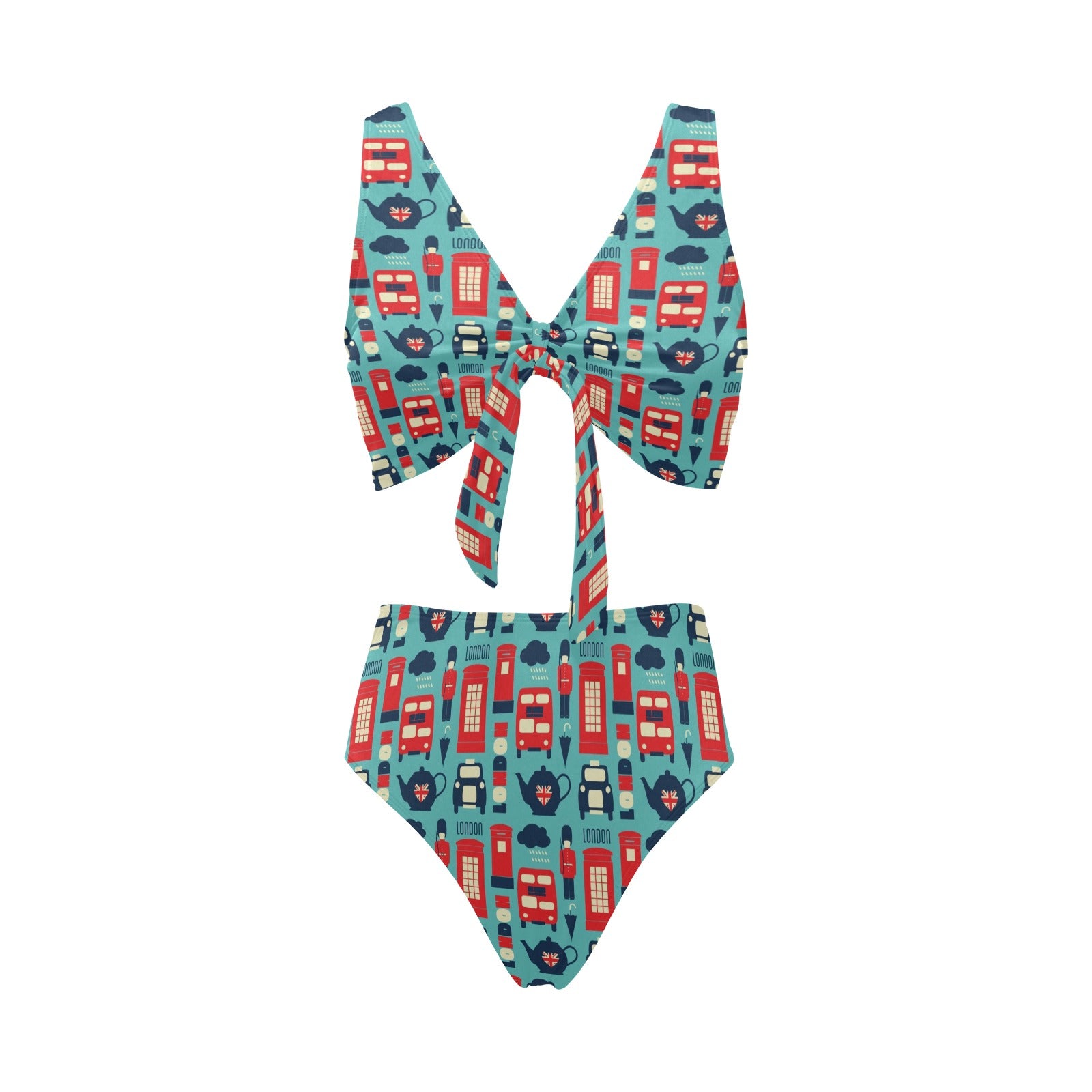 British Pattern Print Design 04 Chest Bowknot High Waisted Bikini Swimsuit