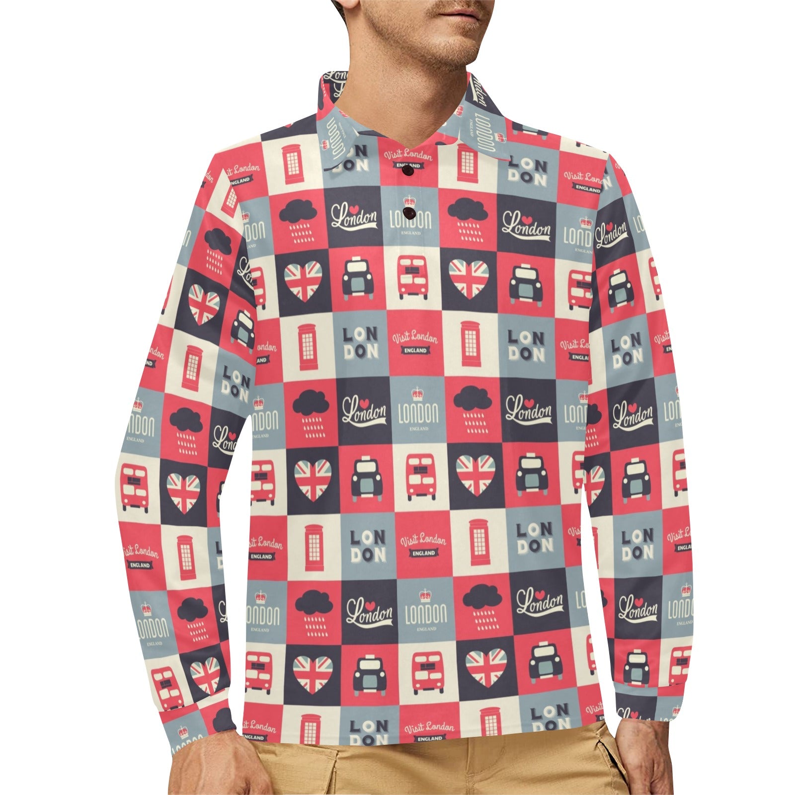 British Pattern Print Design 05 Men's Long Sleeve Polo Shirt