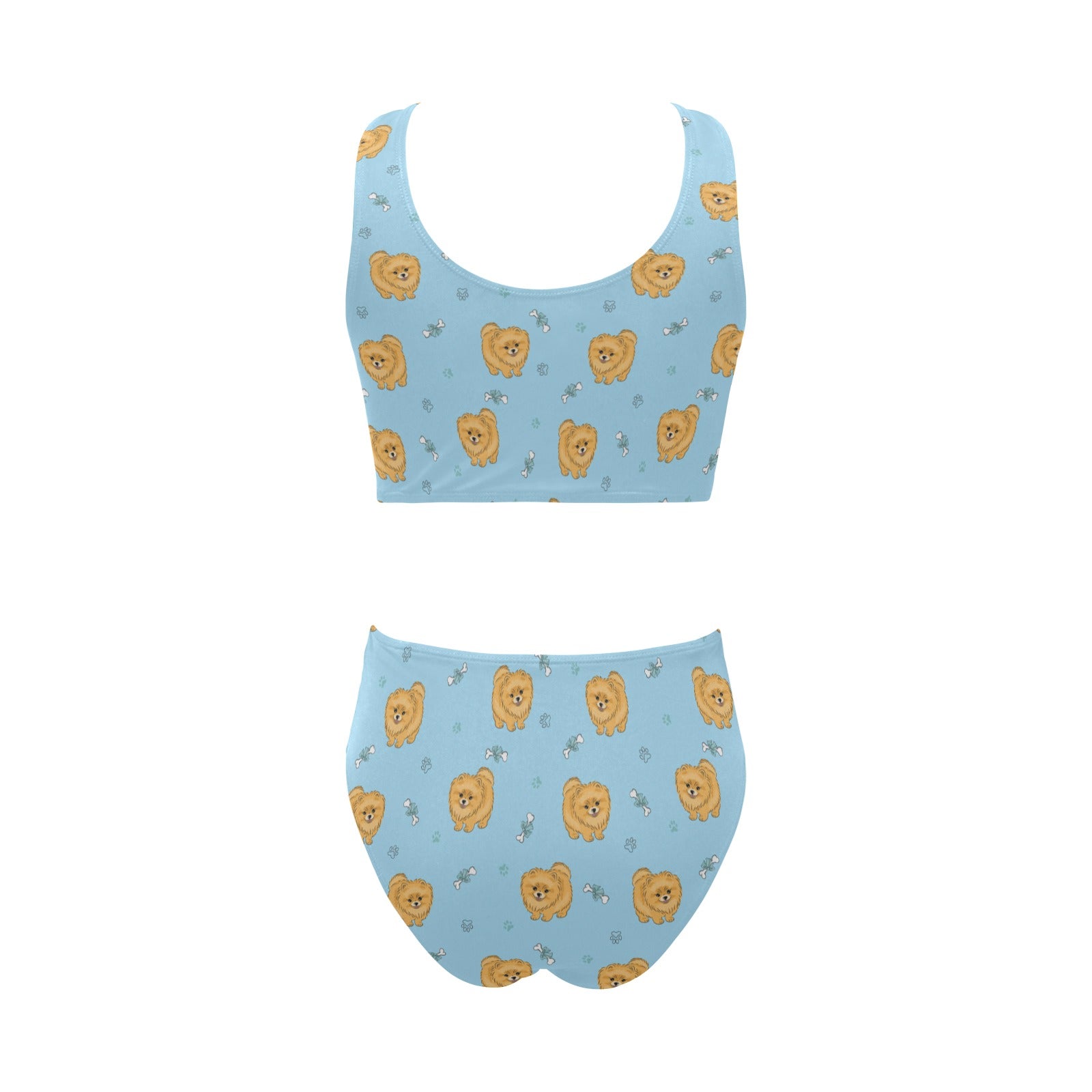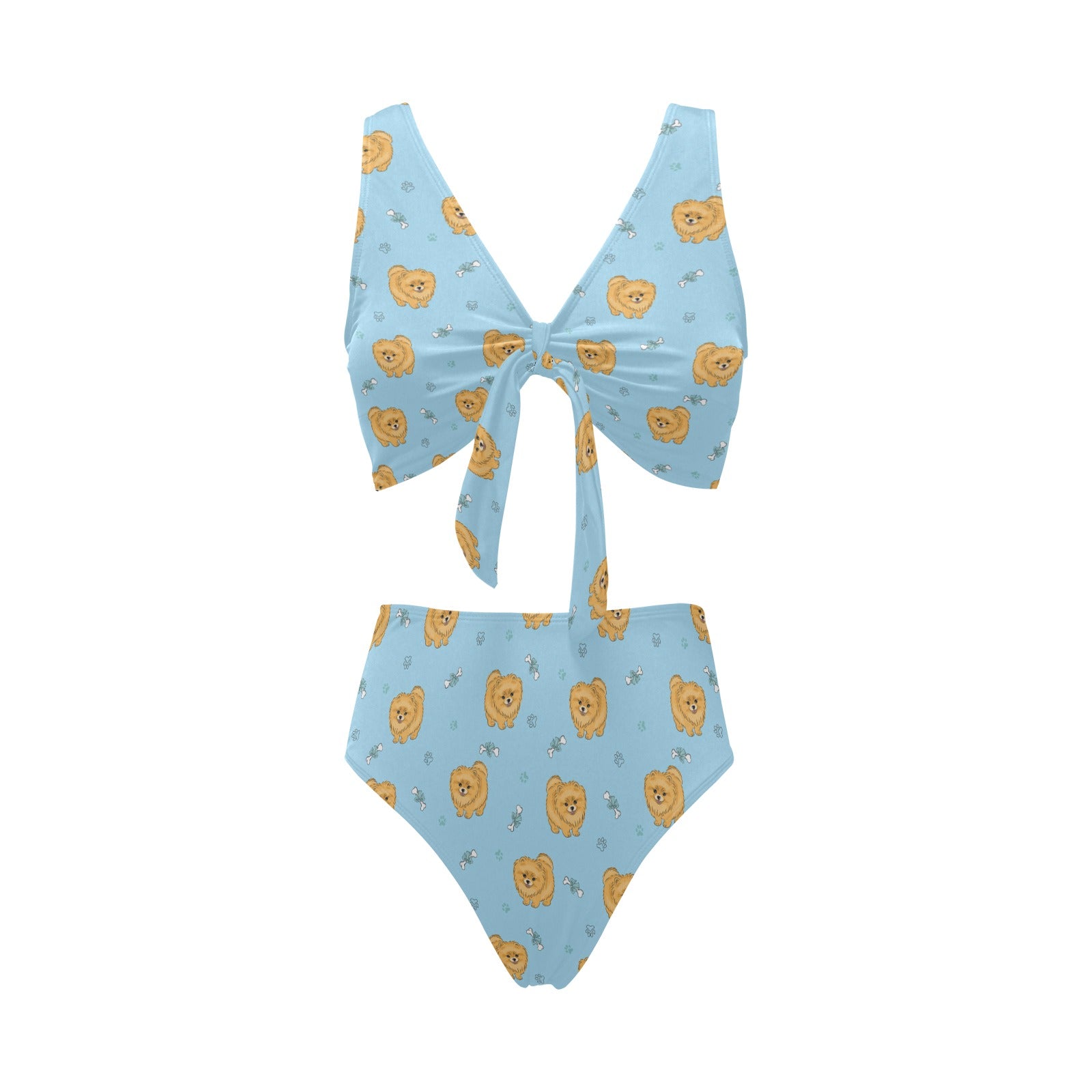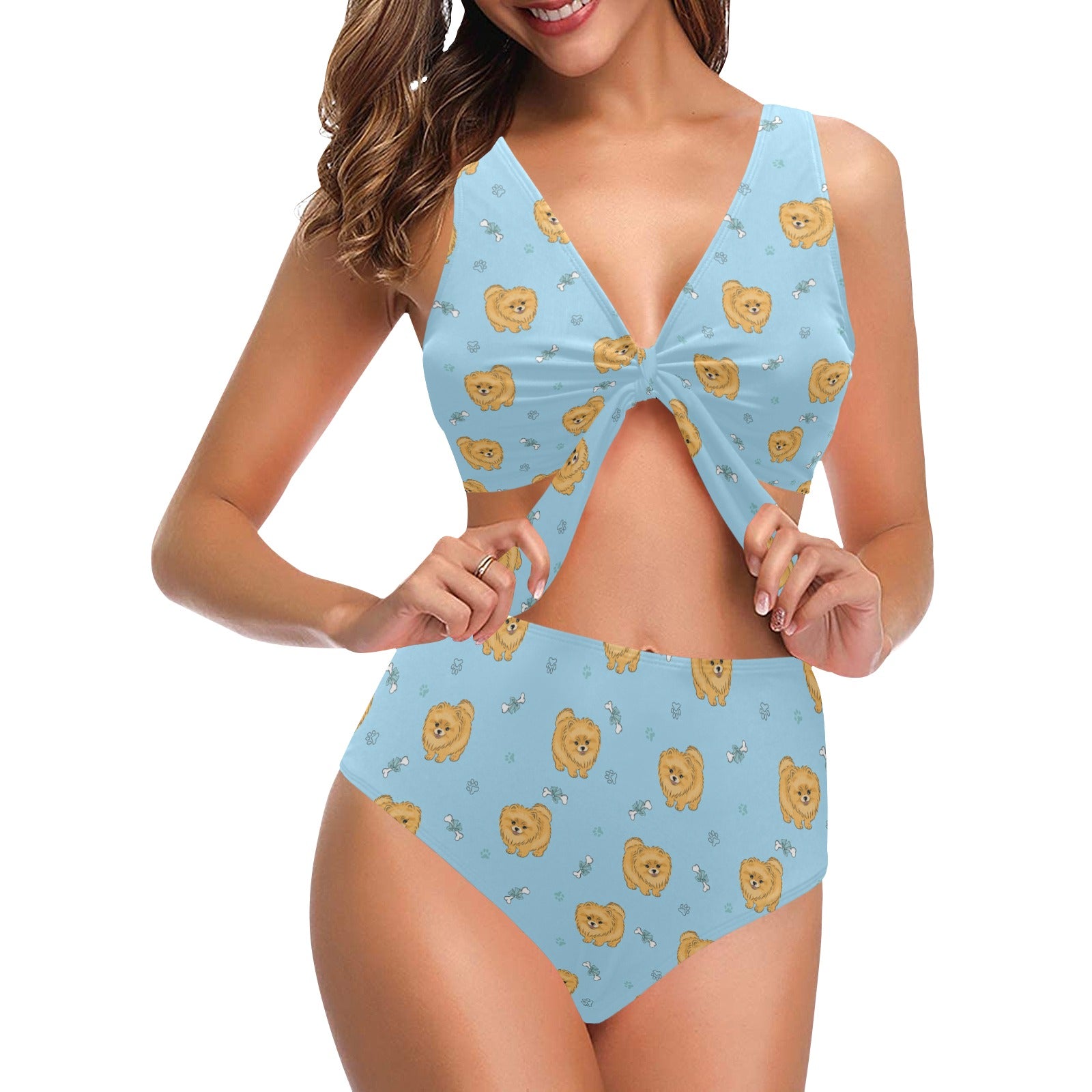 Brown cute pomeranian blue blackground Chest Bowknot High Waisted Bikini Swimsuit