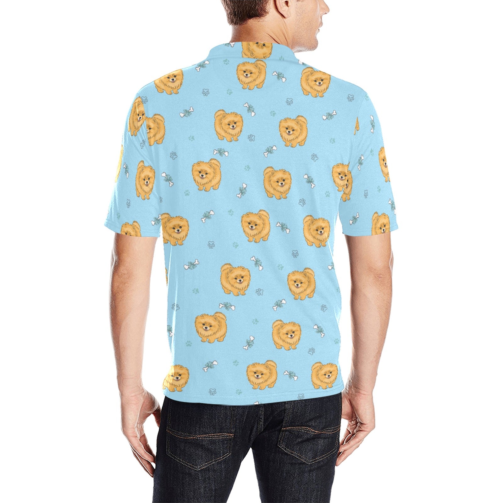 Brown cute pomeranian blue blackground Men's All Over Print Polo Shirt