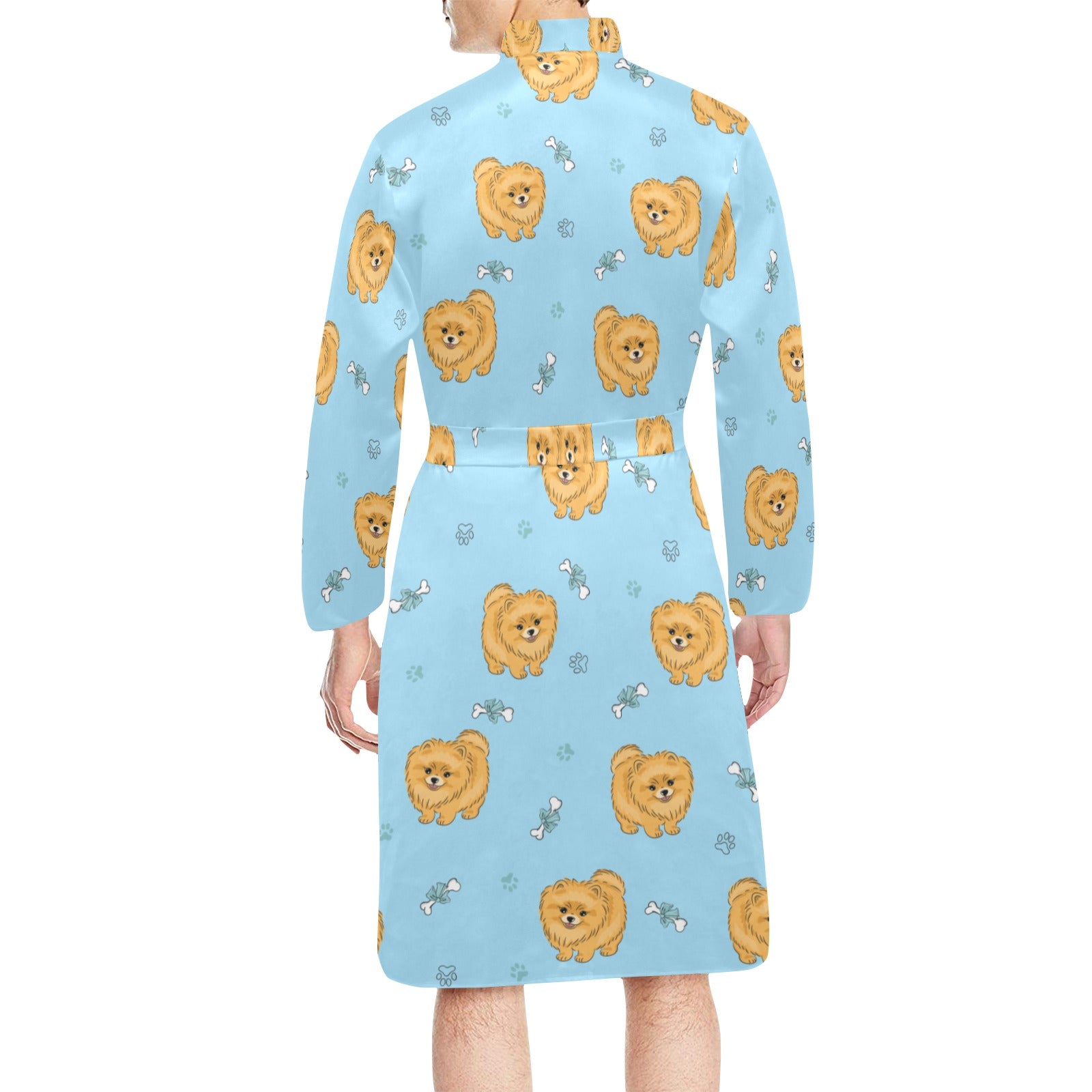 Brown cute pomeranian blue blackground Men's Long Sleeve Belted Night Robe