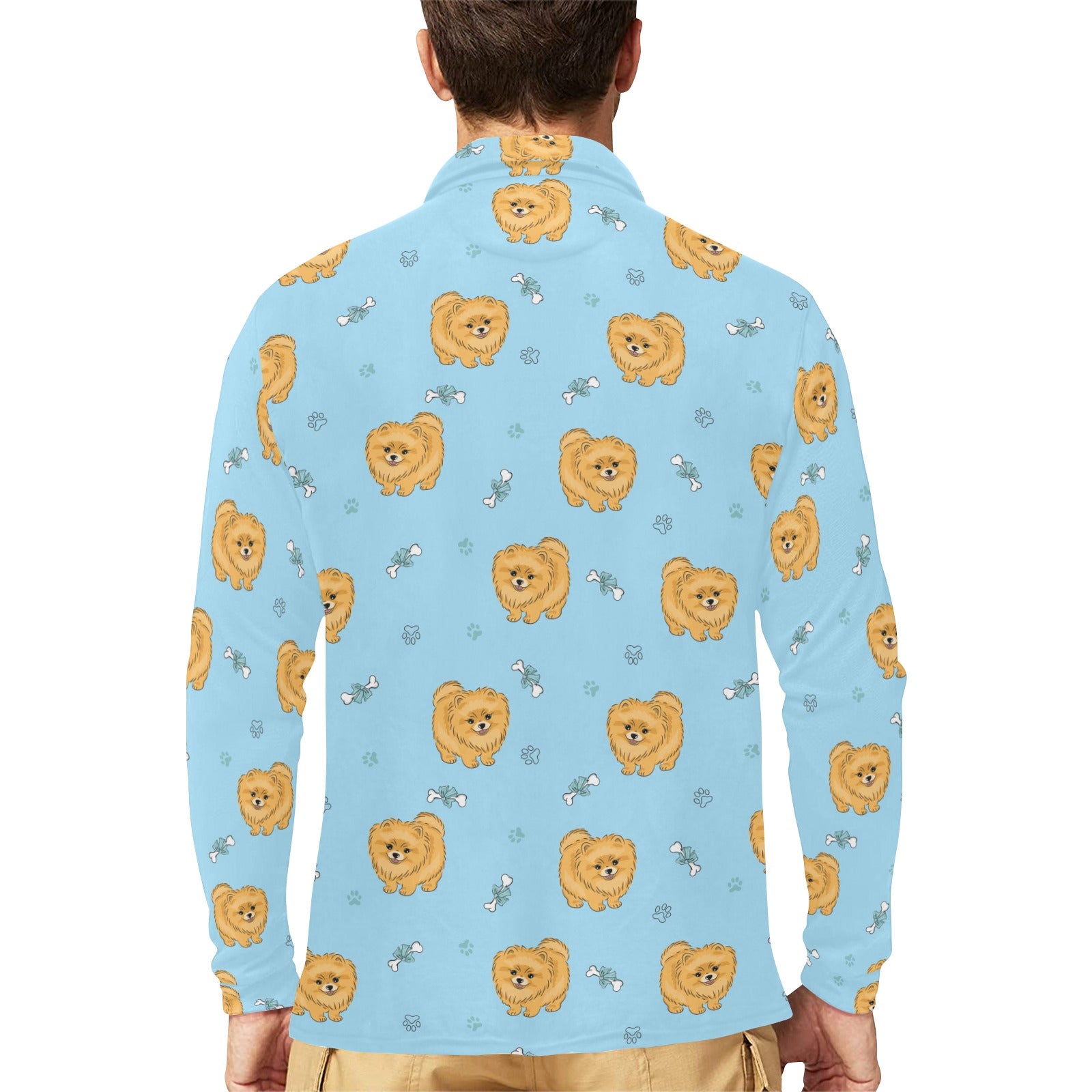 Brown cute pomeranian blue blackground Men's Long Sleeve Polo Shirt
