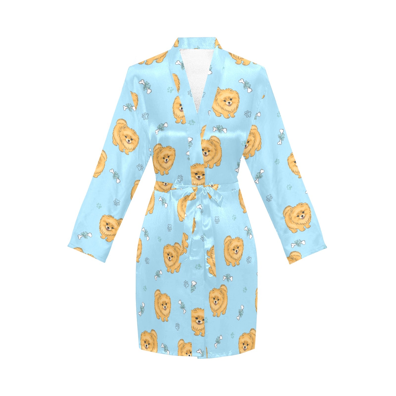 Brown cute pomeranian blue blackground Women's Long Sleeve Belted Night Robe
