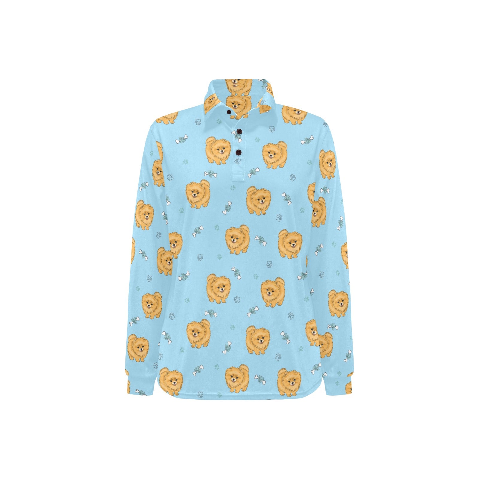 Brown cute pomeranian blue blackground Women's Long Sleeve Polo Shirt