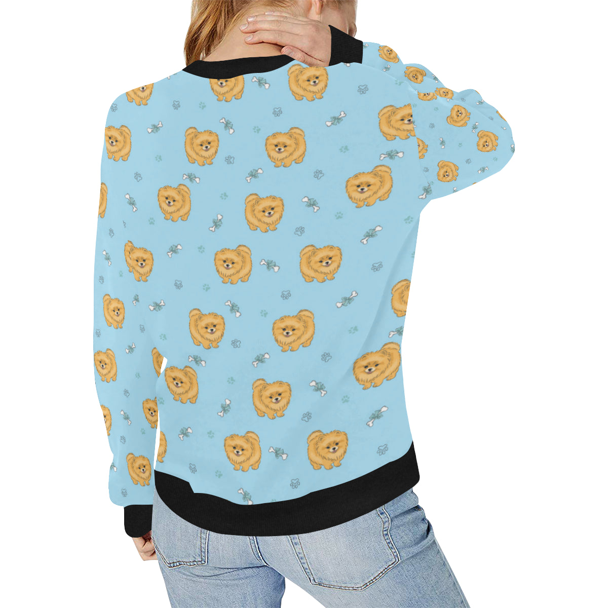 Brown cute pomeranian blue blackground Women's Crew Neck Sweatshirt