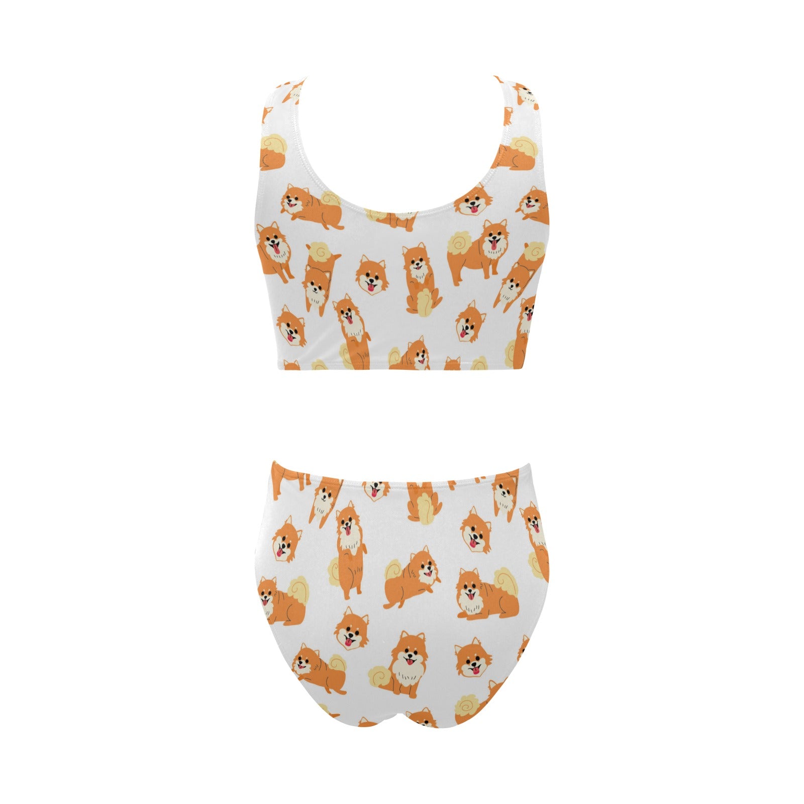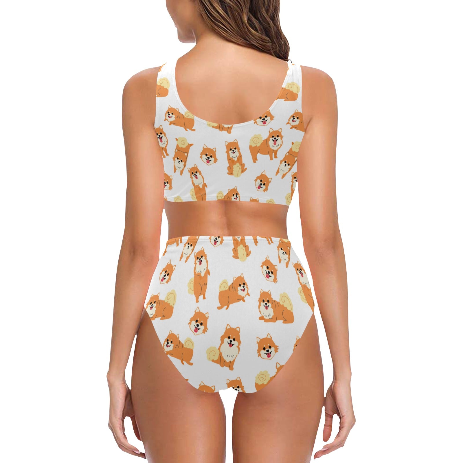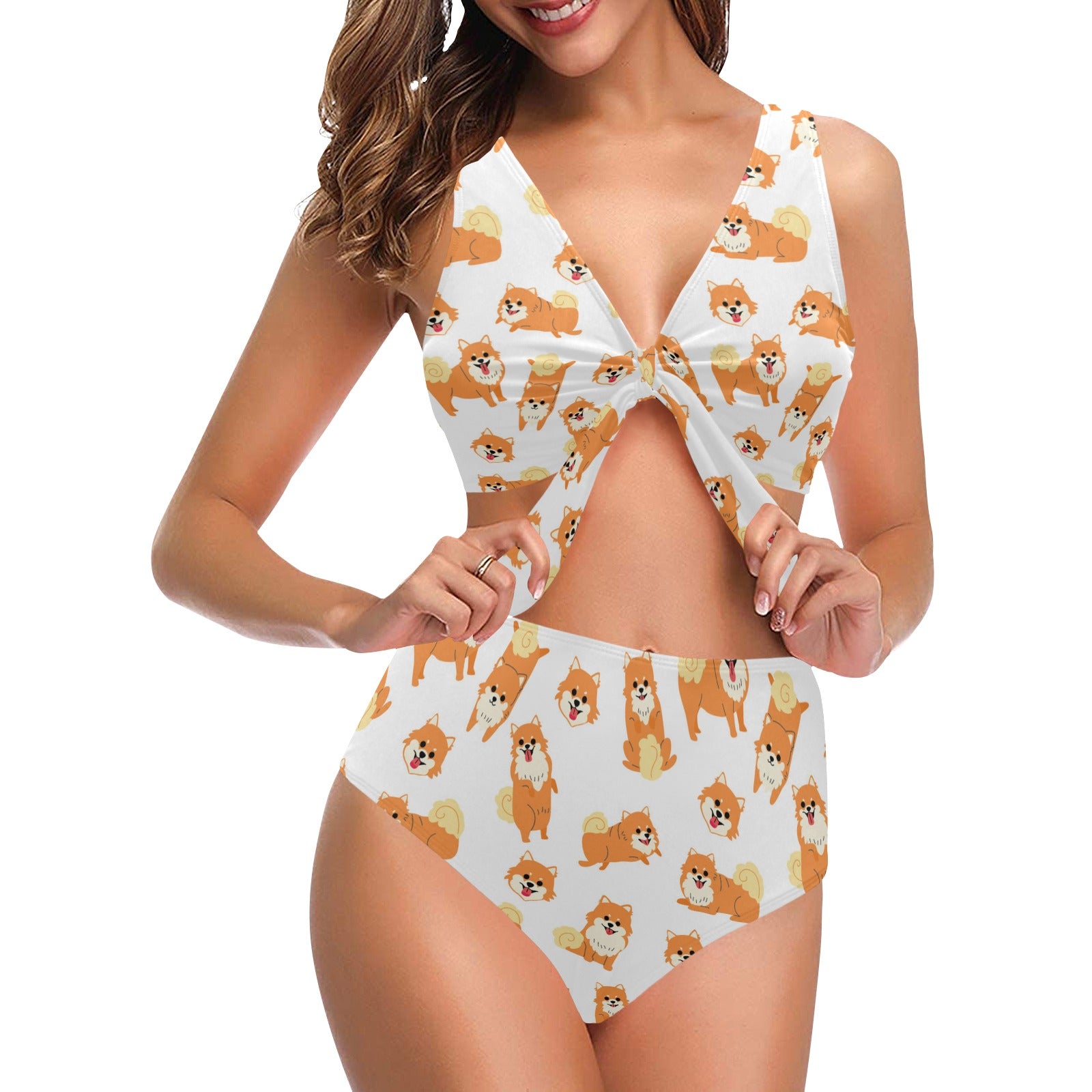 Brown pomeranian pattern Chest Bowknot High Waisted Bikini Swimsuit