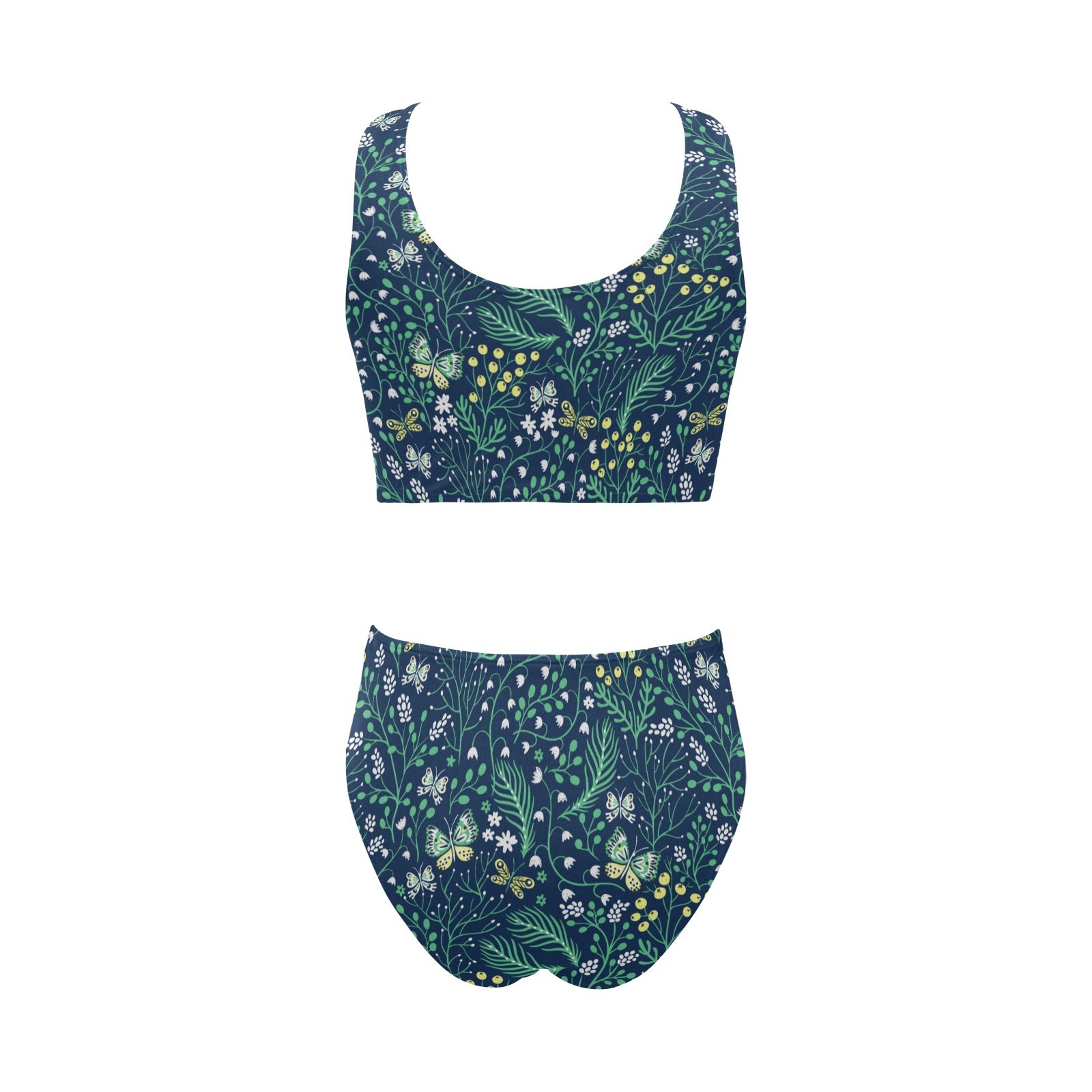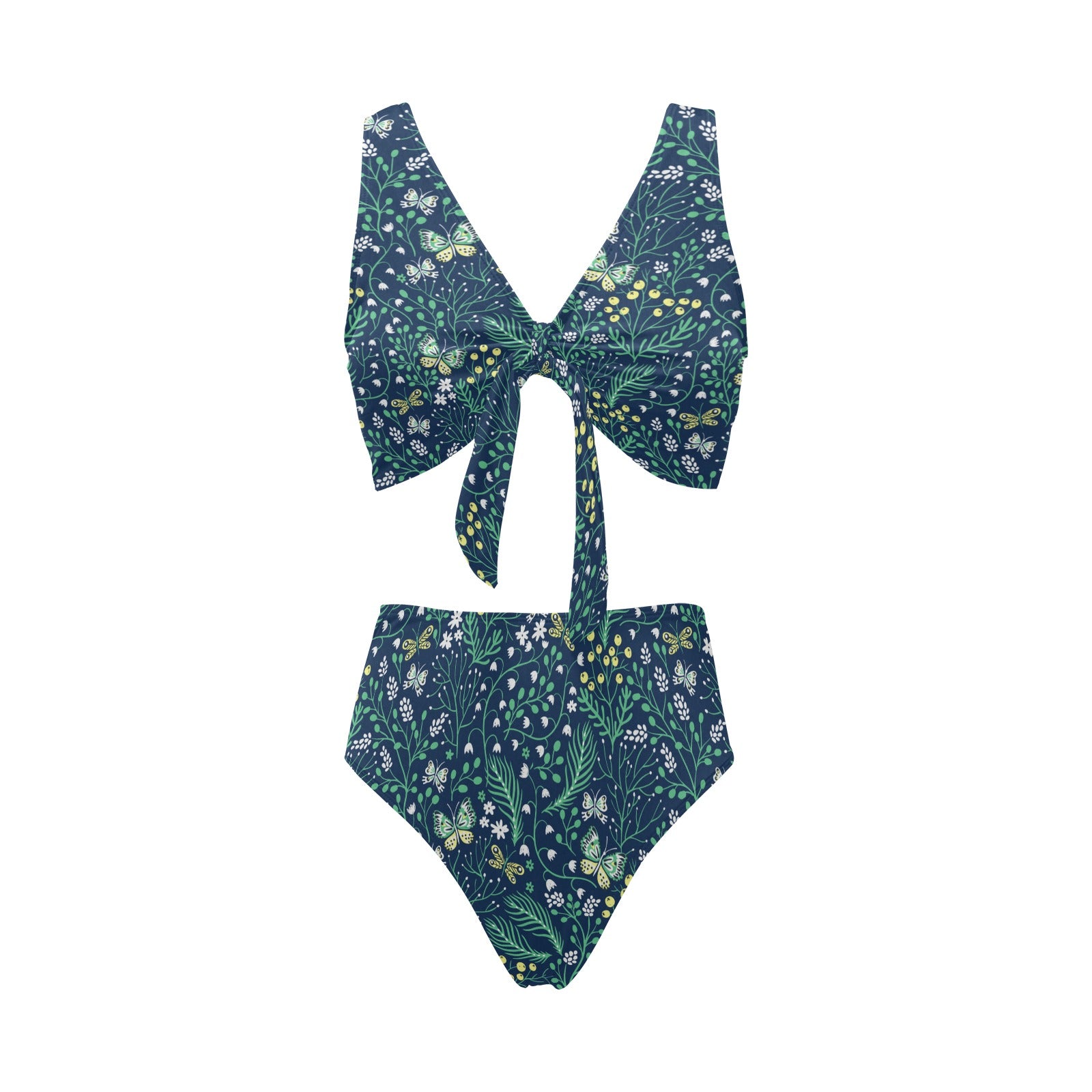 butterfly leaves pattern Chest Bowknot High Waisted Bikini Swimsuit