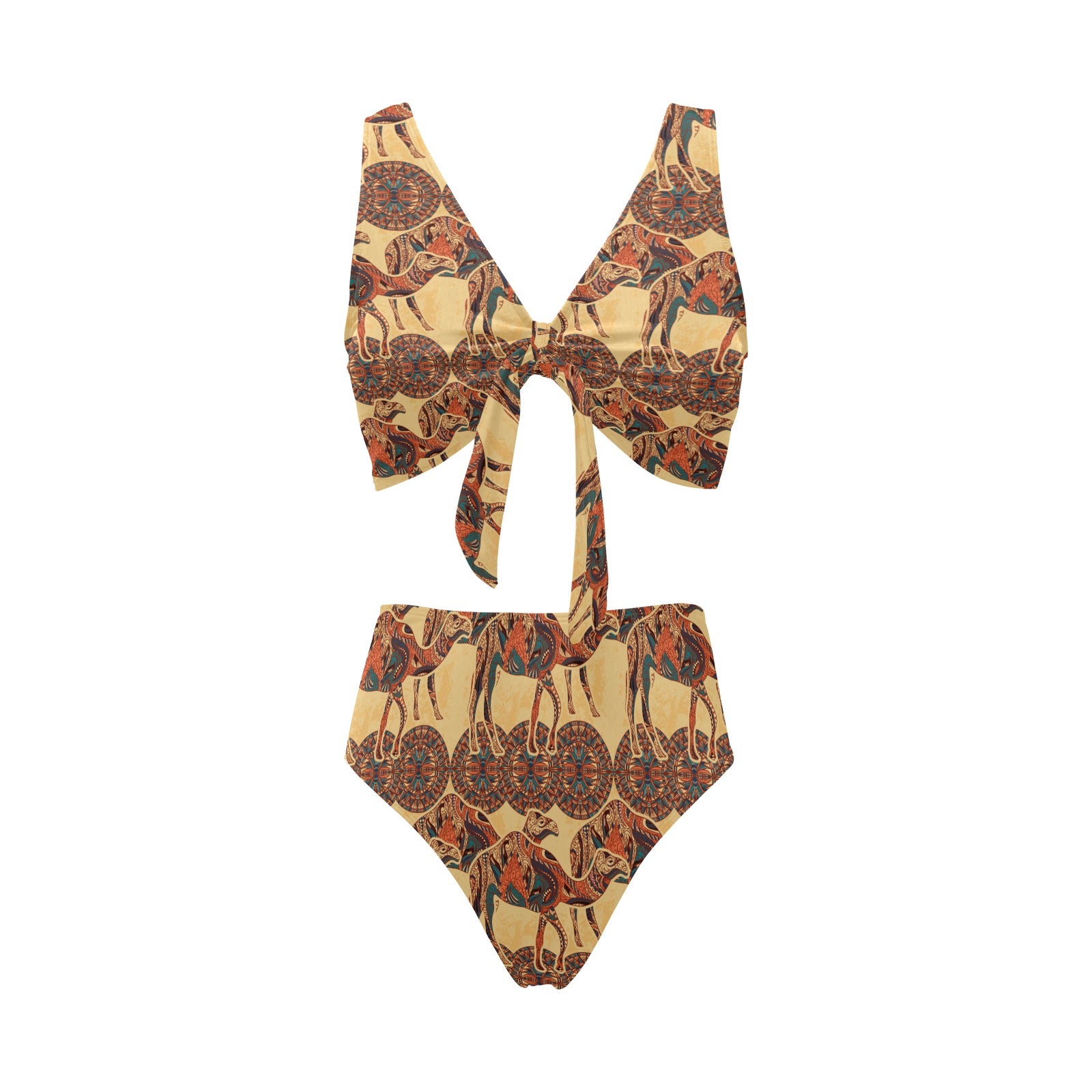 Camel polynesian tribal design pattern Chest Bowknot High Waisted Bikini Swimsuit