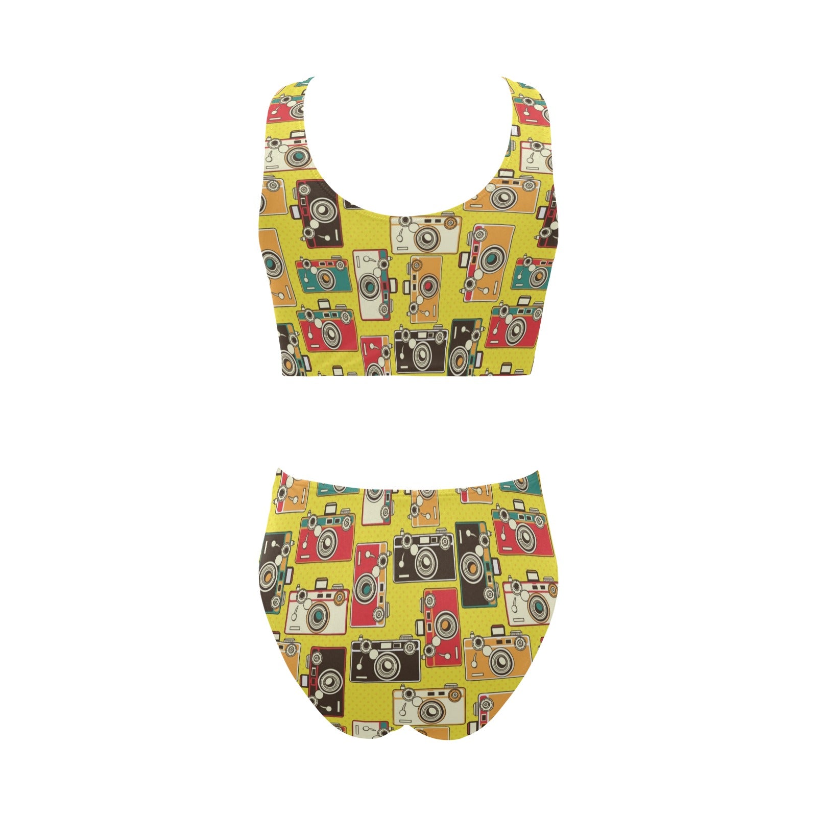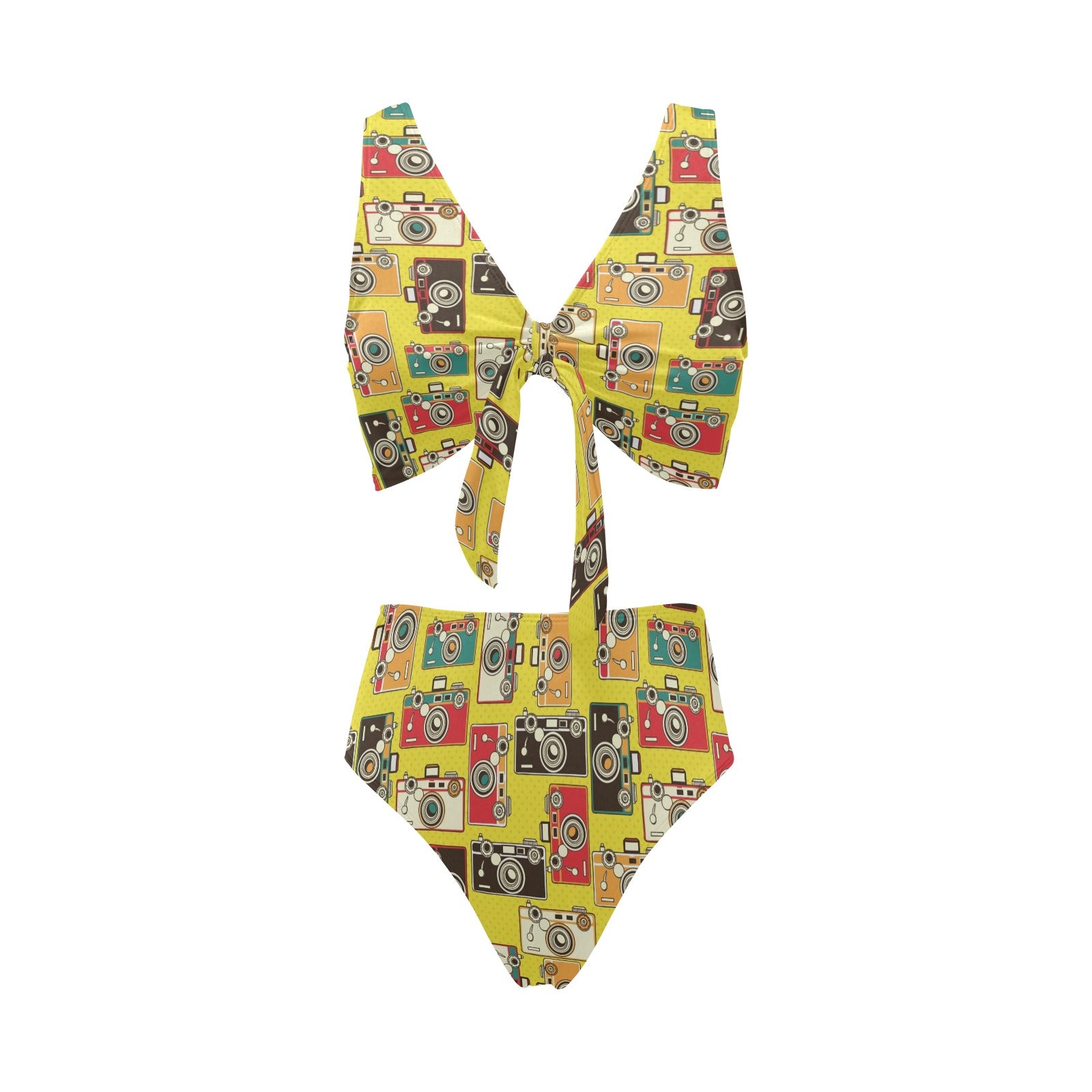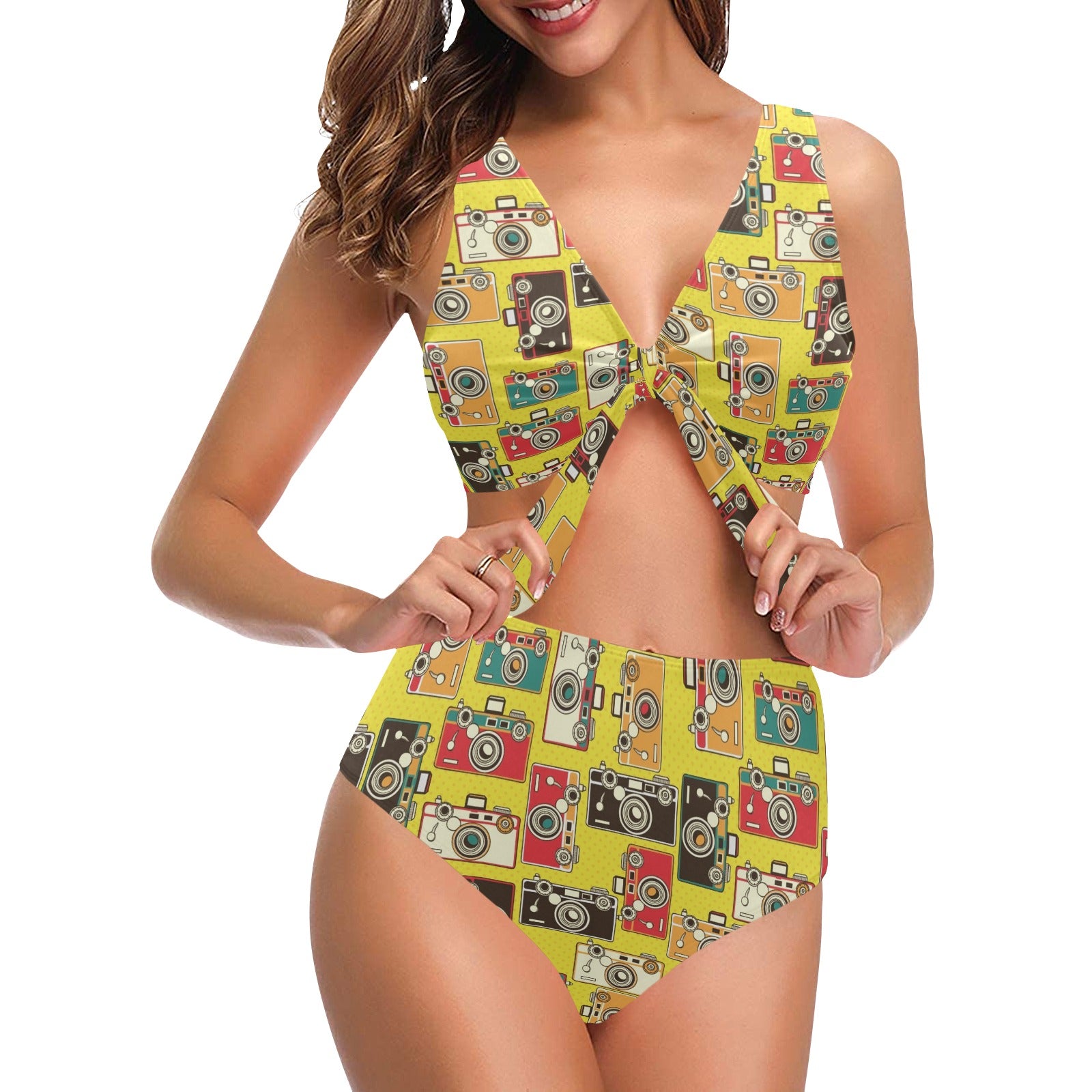 Camera Pattern Print Design 02 Chest Bowknot High Waisted Bikini Swimsuit