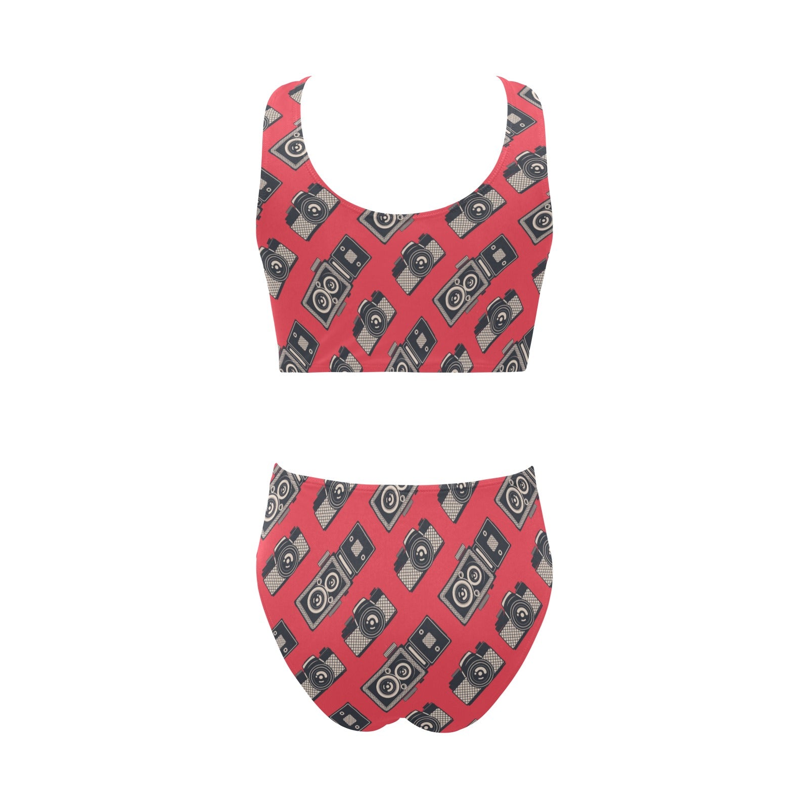 Camera Pattern Print Design 05 Chest Bowknot High Waisted Bikini Swimsuit
