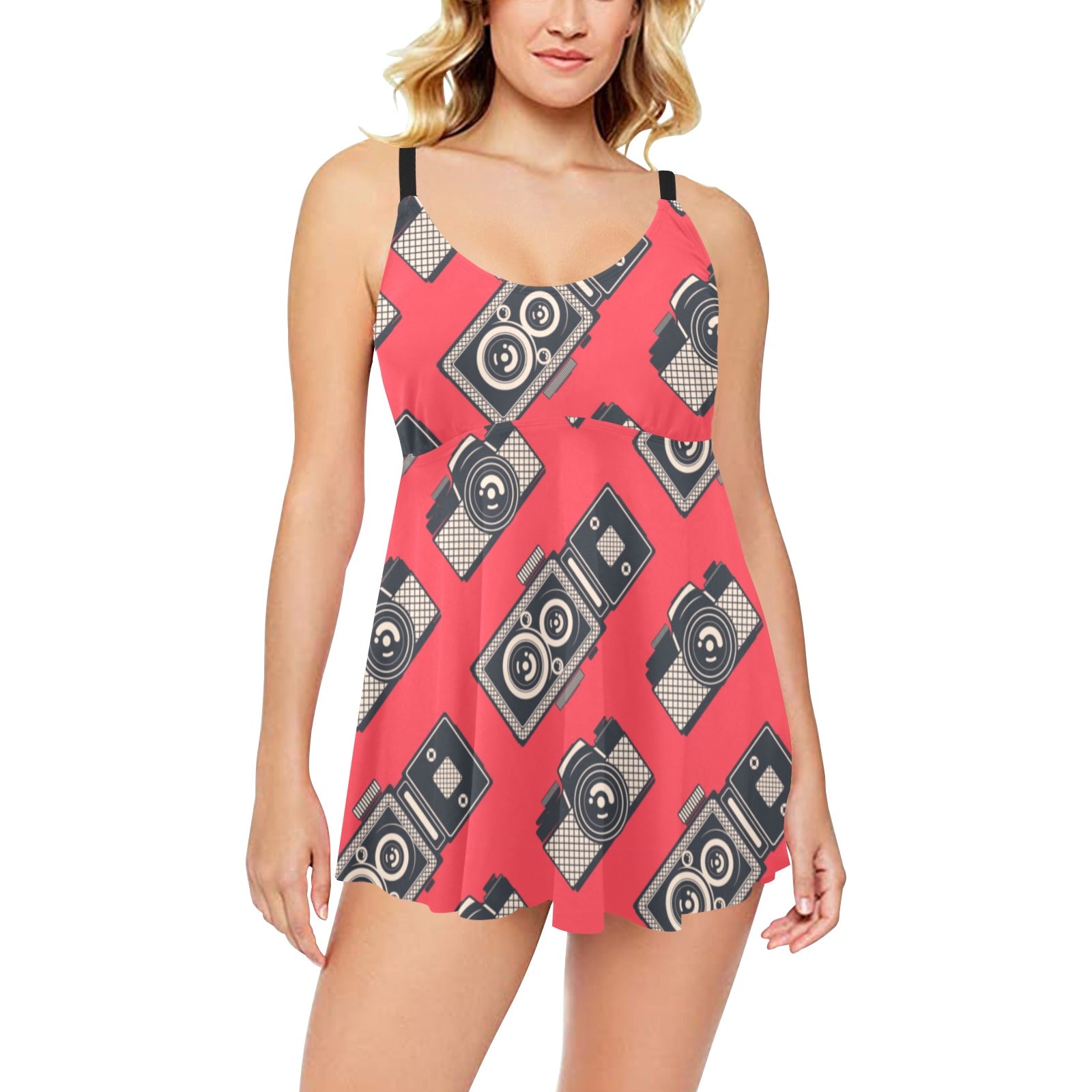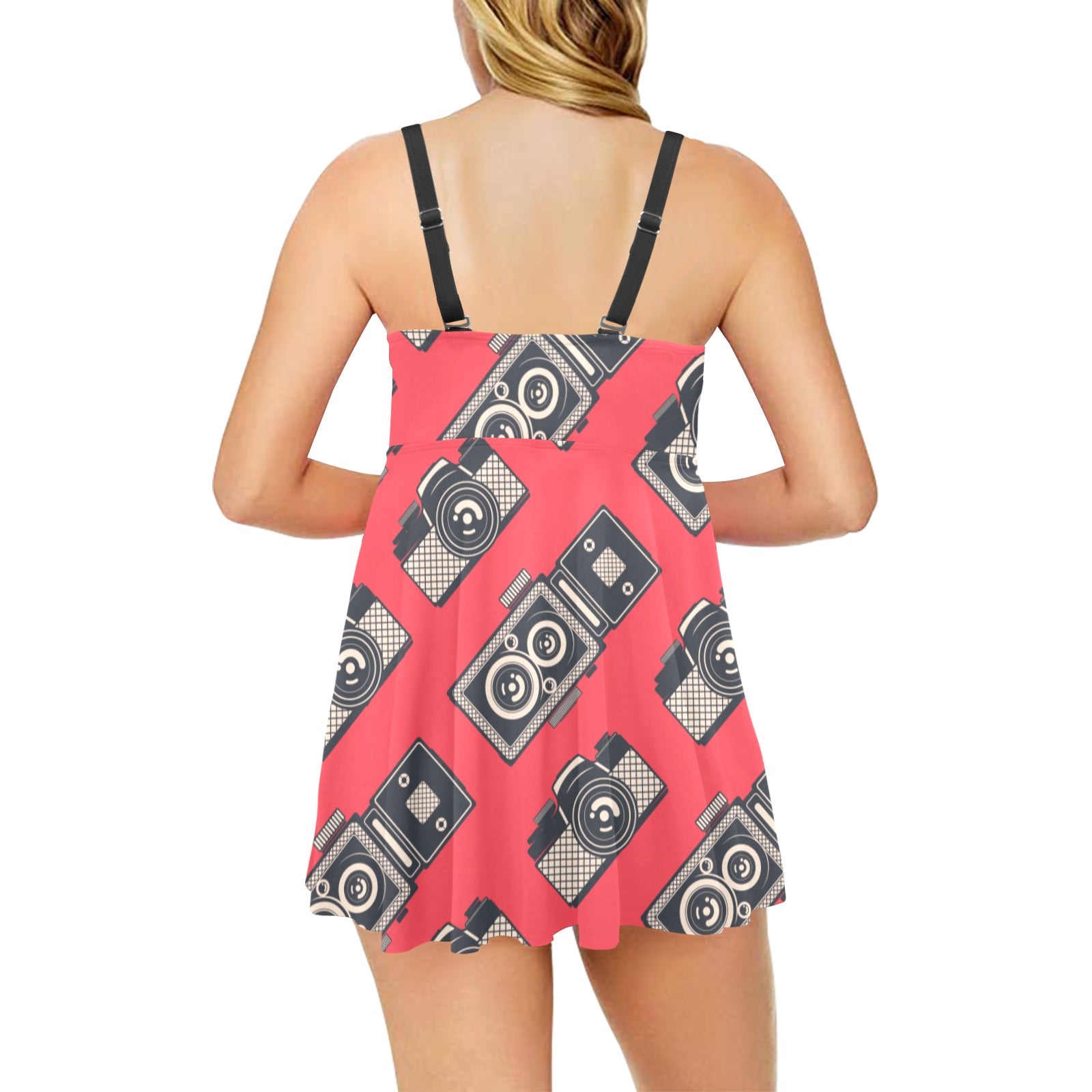 Camera Pattern Print Design 05 Chest Sexy Pleated Two Piece Swim Dress
