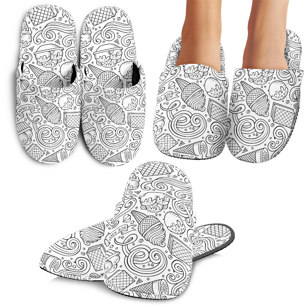 Cartoon Hand Drawn Ice Cream Black White Slippers
