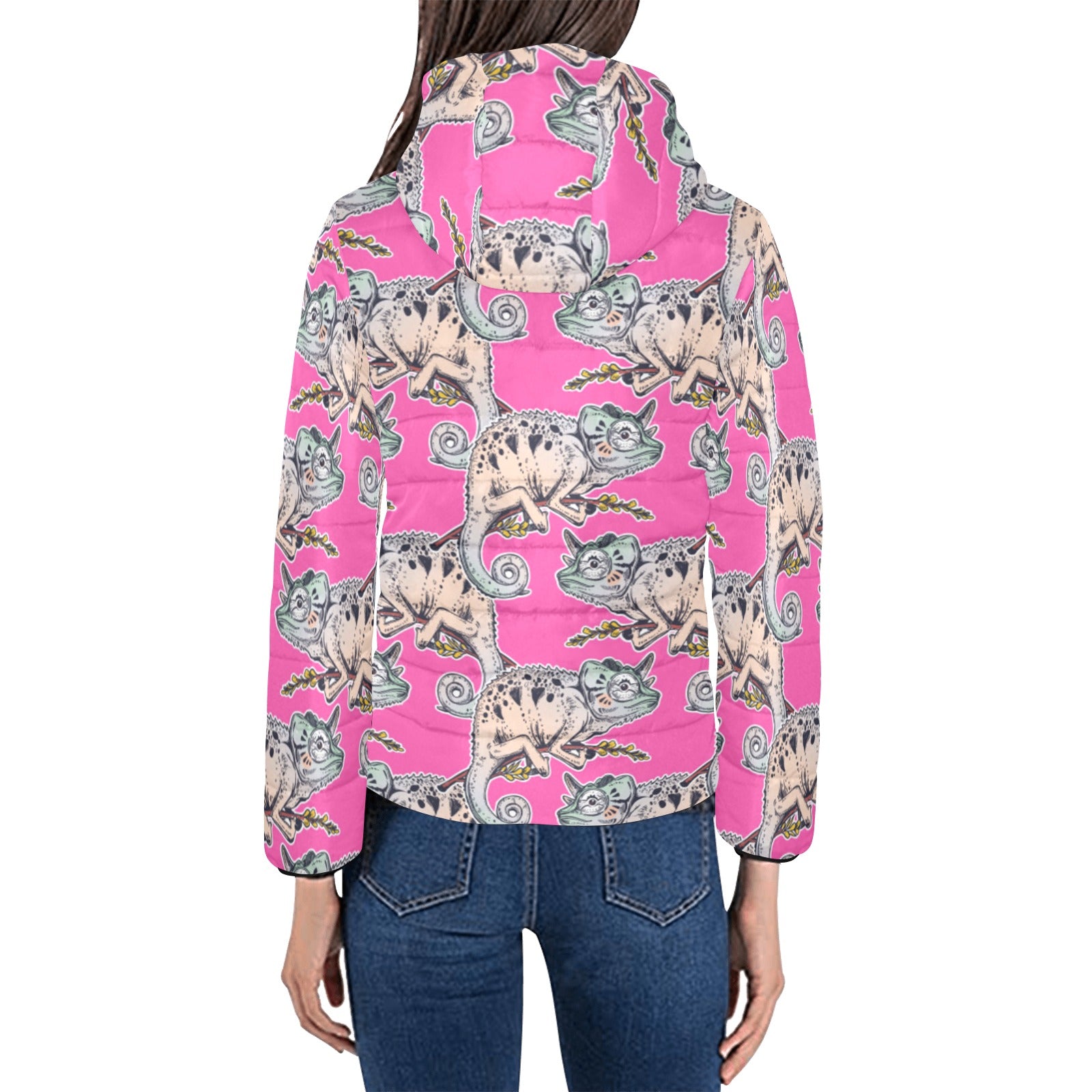 Chameleon lizard pattern pink background Women's Padded Hooded Jacket