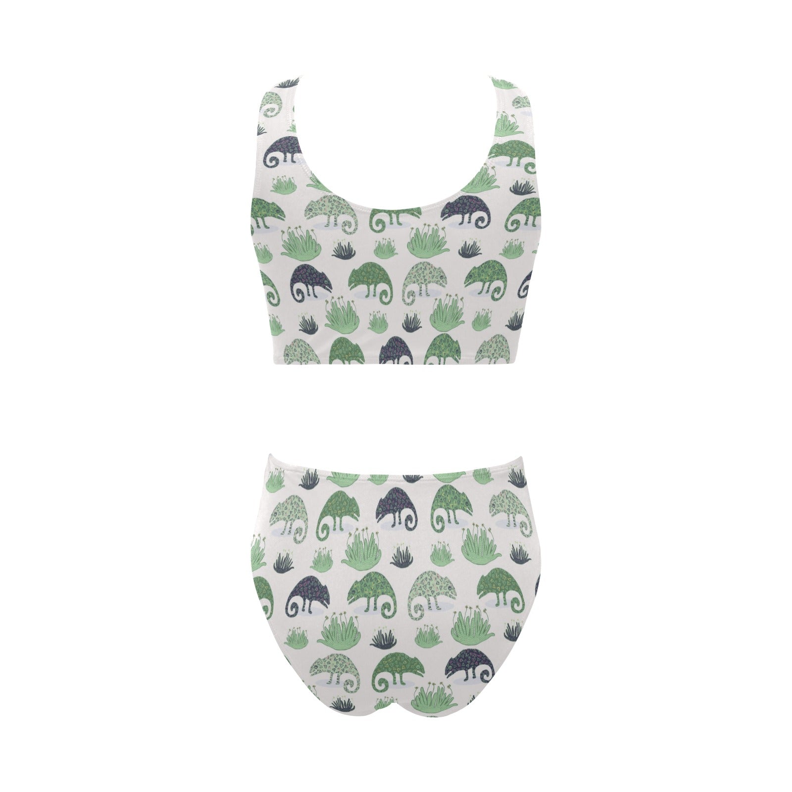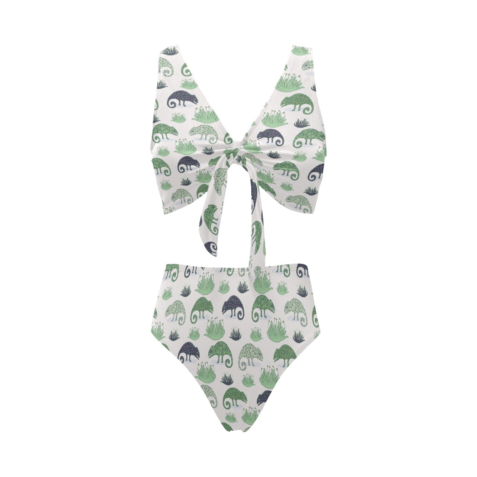 Chameleon lizard succulent plant pattern Chest Bowknot High Waisted Bikini Swimsuit