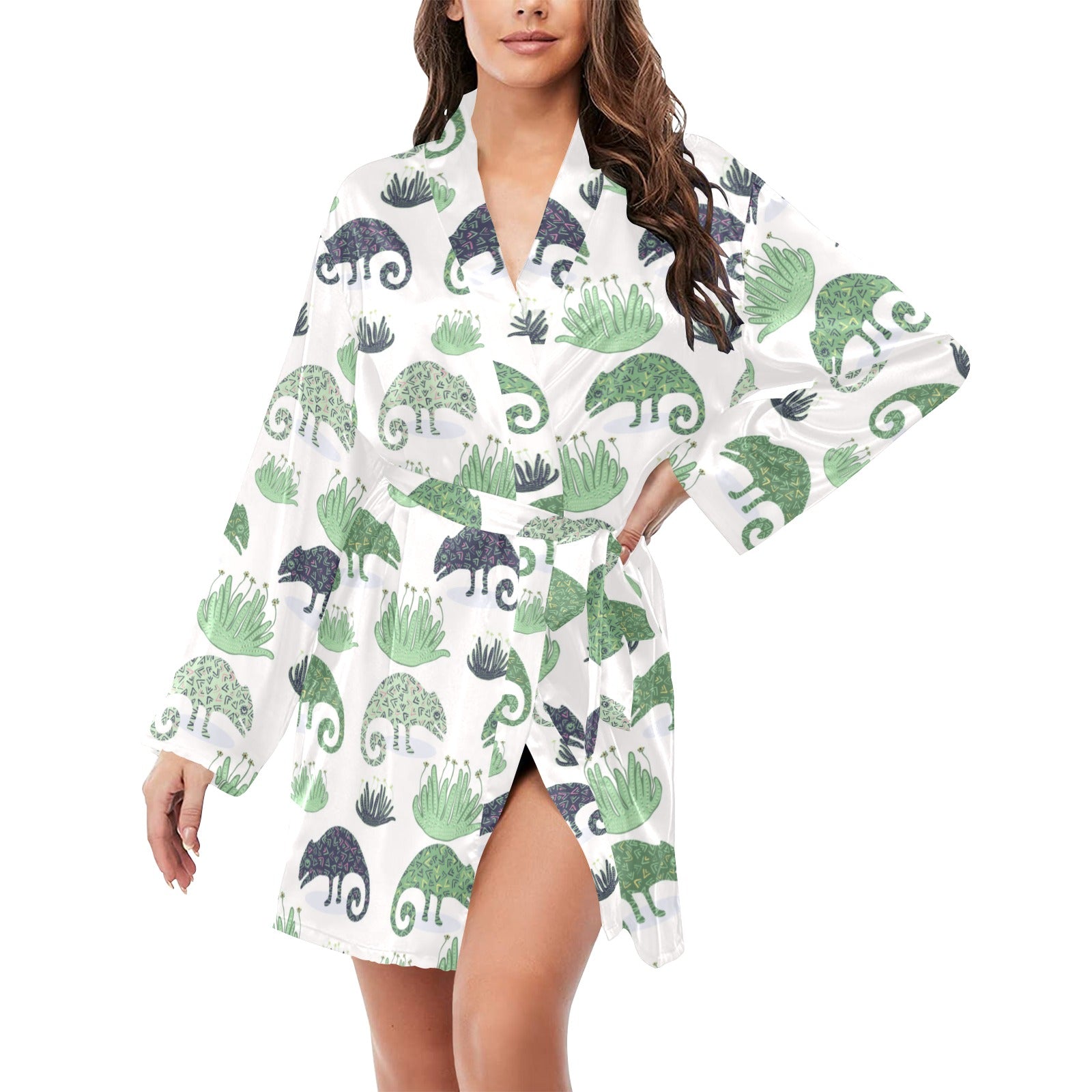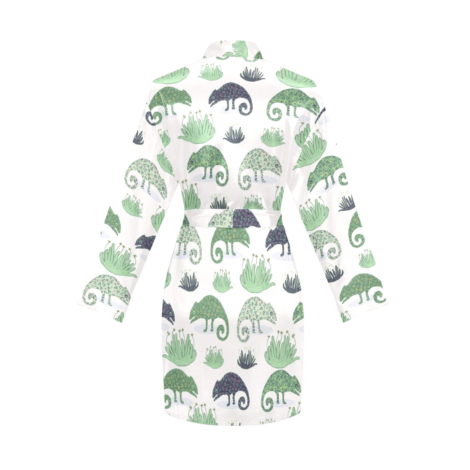 Chameleon lizard succulent plant pattern Women's Long Sleeve Belted Night Robe