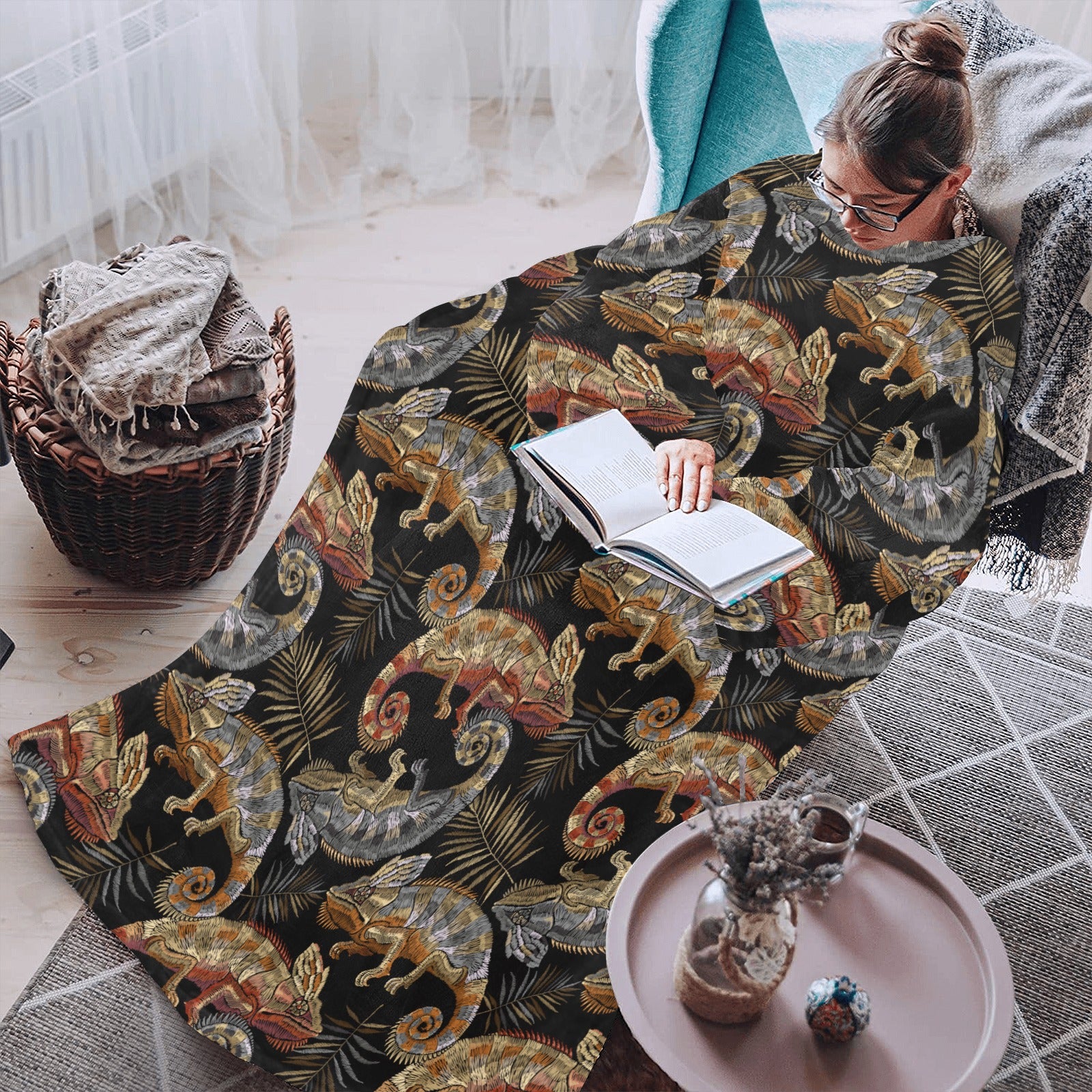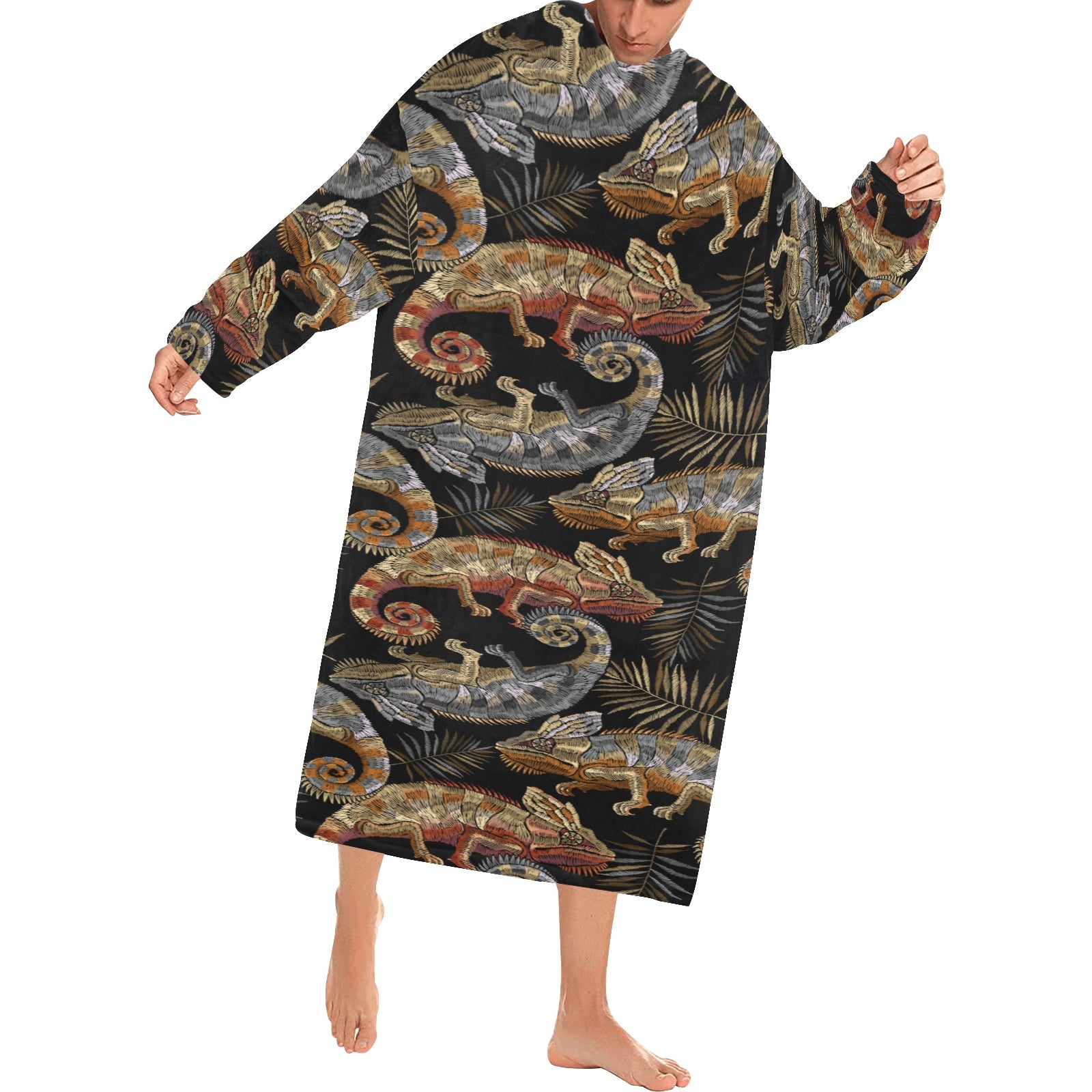 Chameleon lizard tropical leaves palm tree Blanket Robe with Sleeves