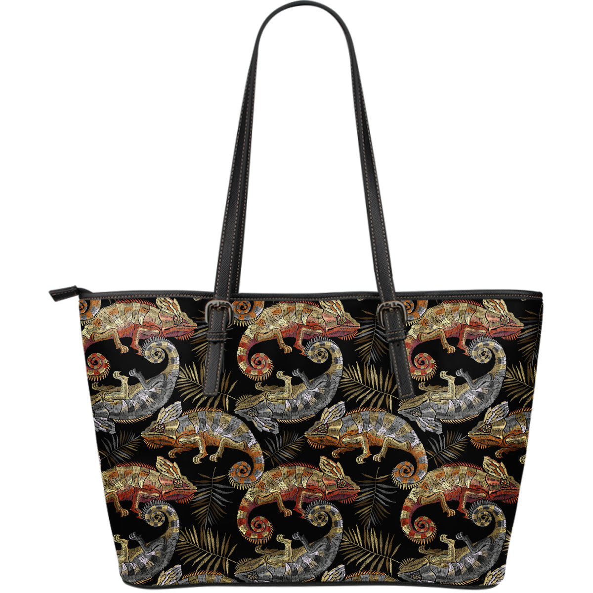 Chameleon lizard tropical leaves palm tree Large Leather Tote Bag is a uniqued design and limited item. It made to order, hand printed, and sewn with love in our factory.