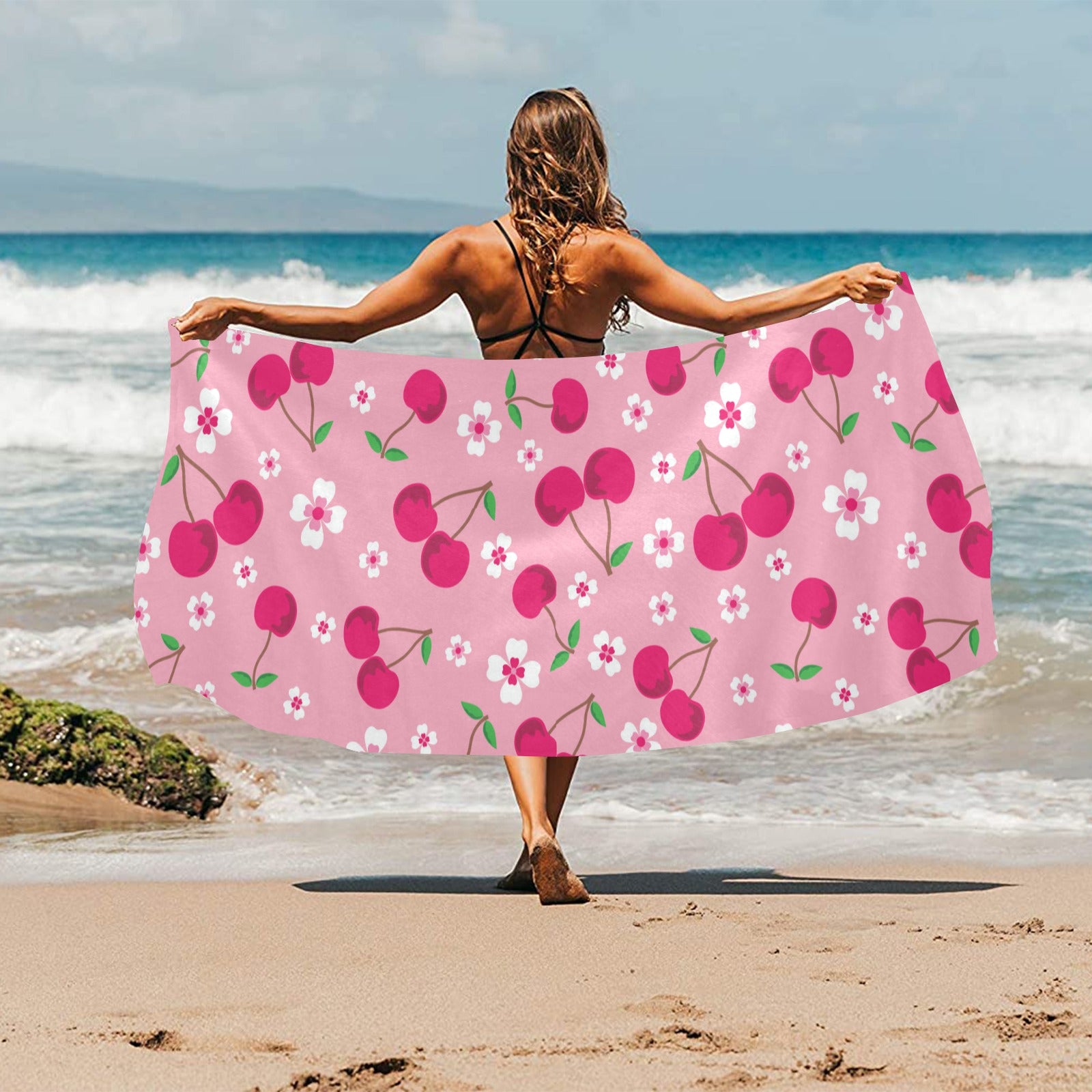 cherry flower pattern pink background Beach Towel