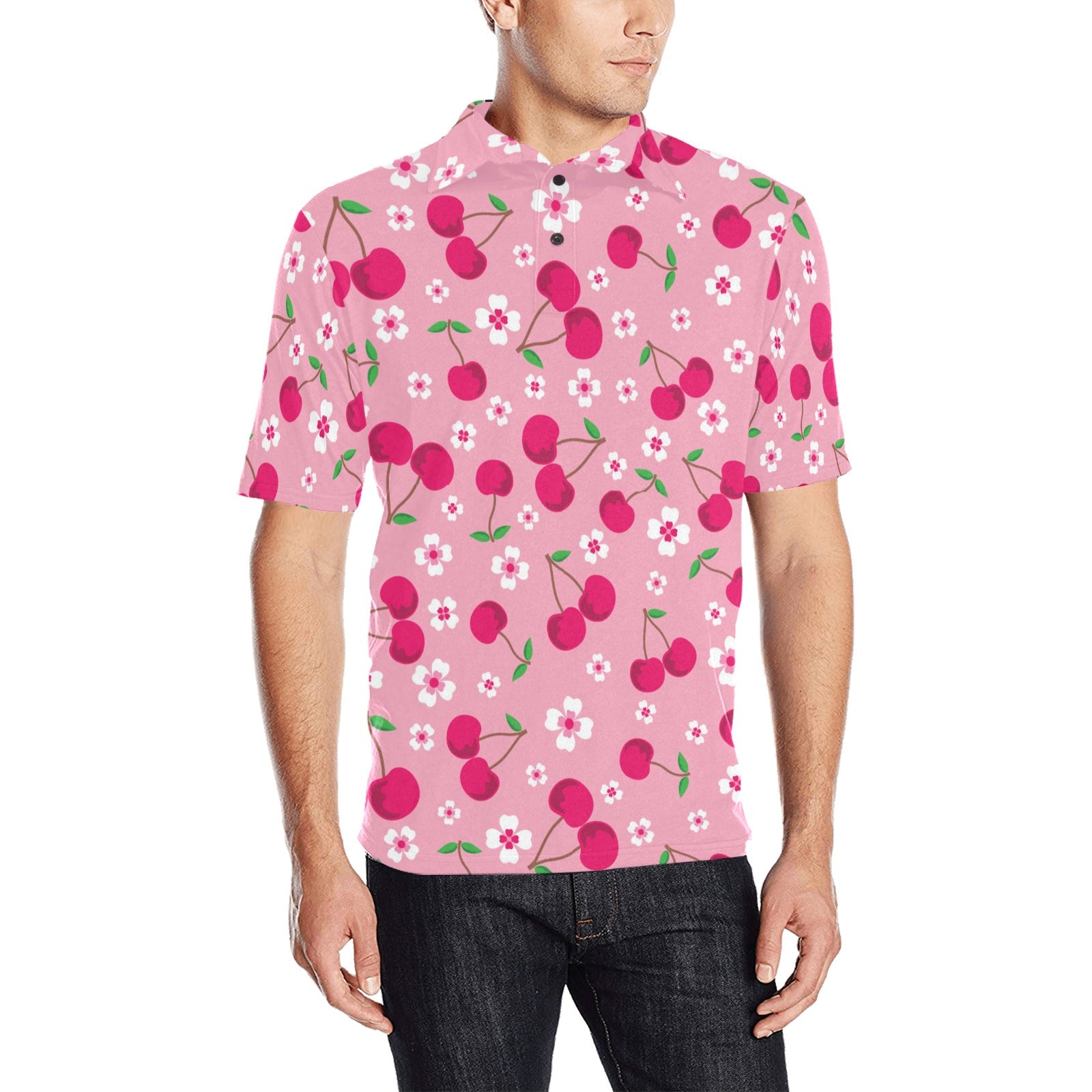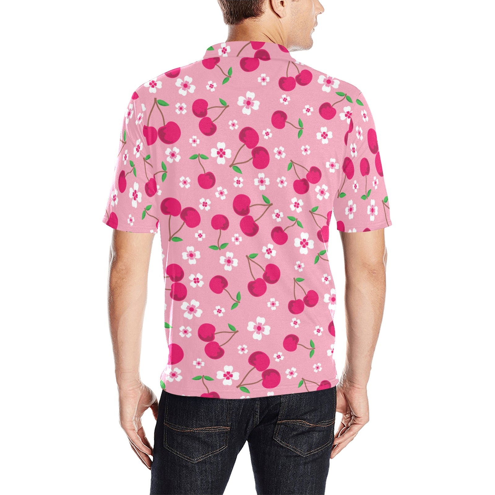 cherry flower pattern pink background Men's All Over Print Polo Shirt