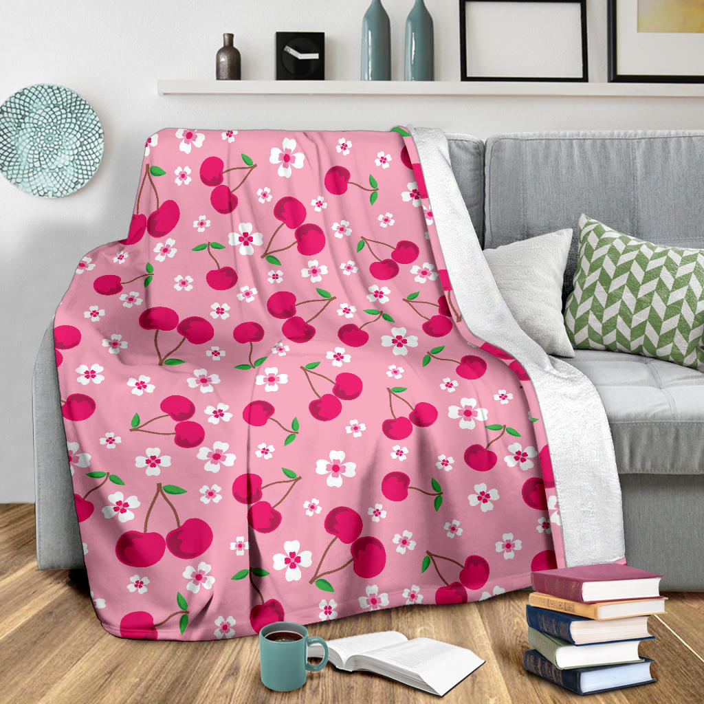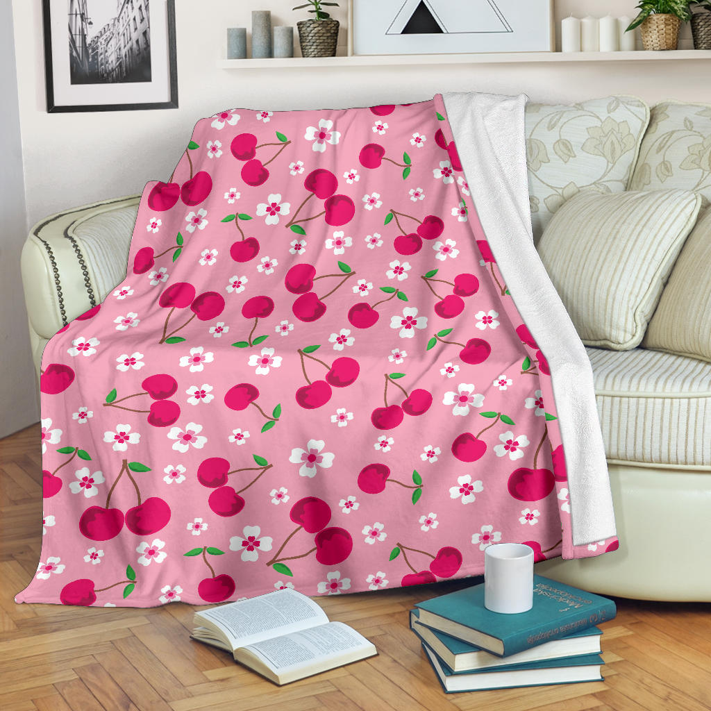 cherry flower pattern pink background Premium Blanket is a uniqued design and limited item. It made to order, hand printed, and sewn with love in our factory.