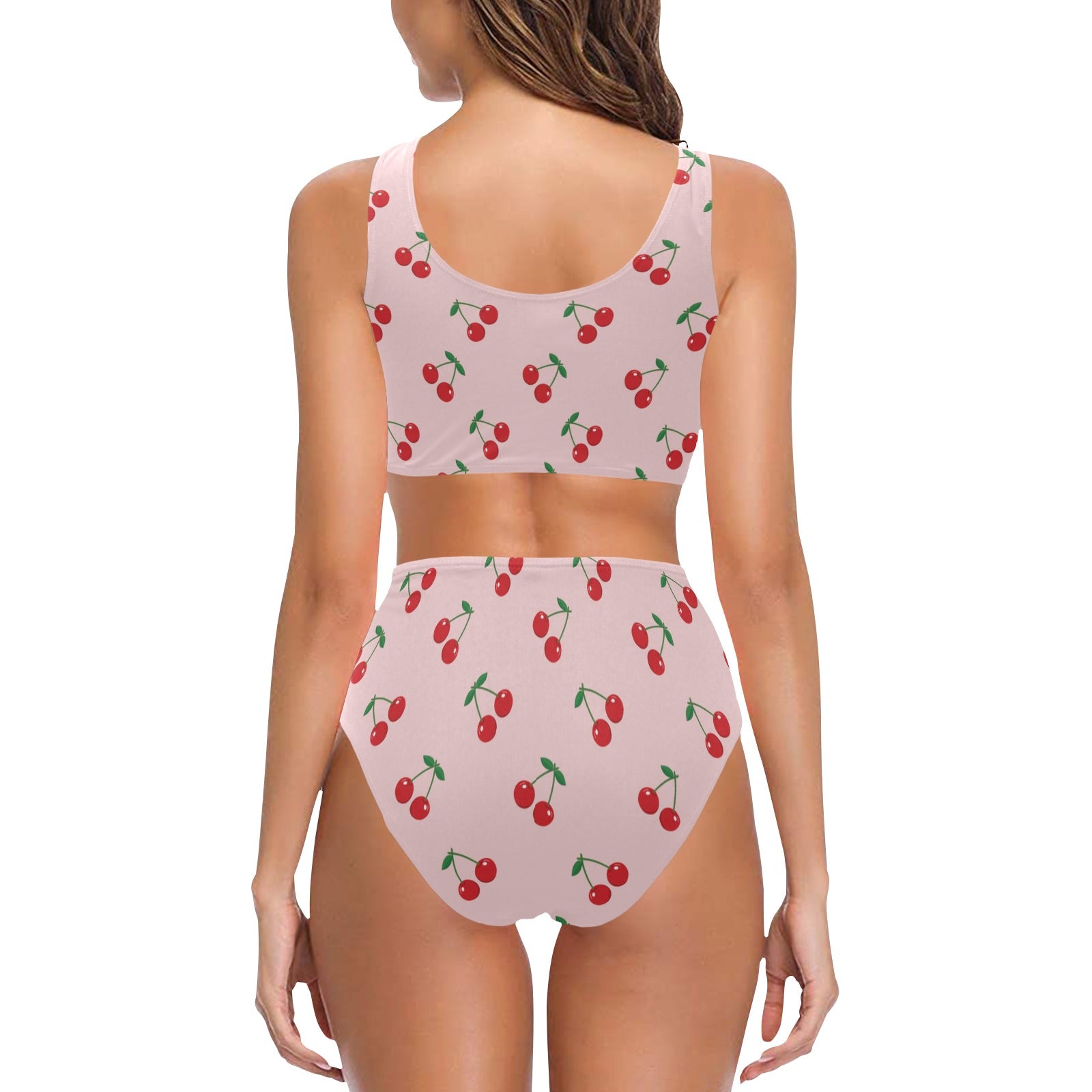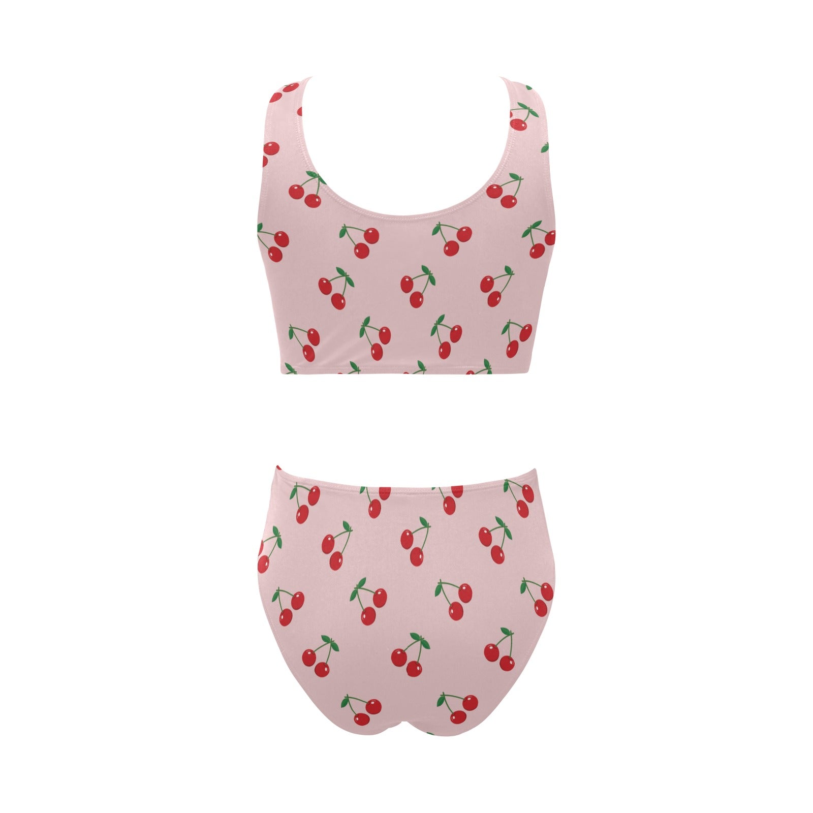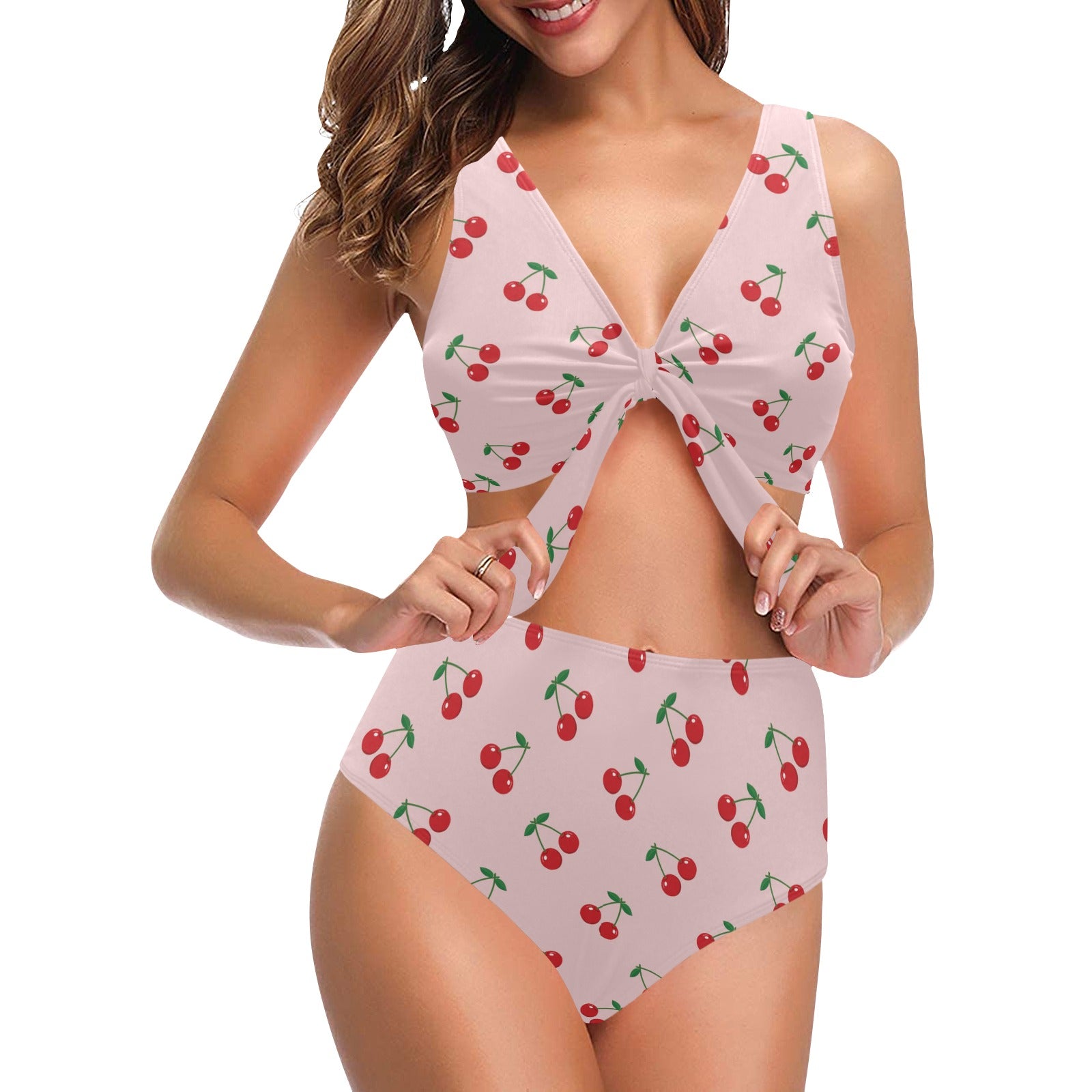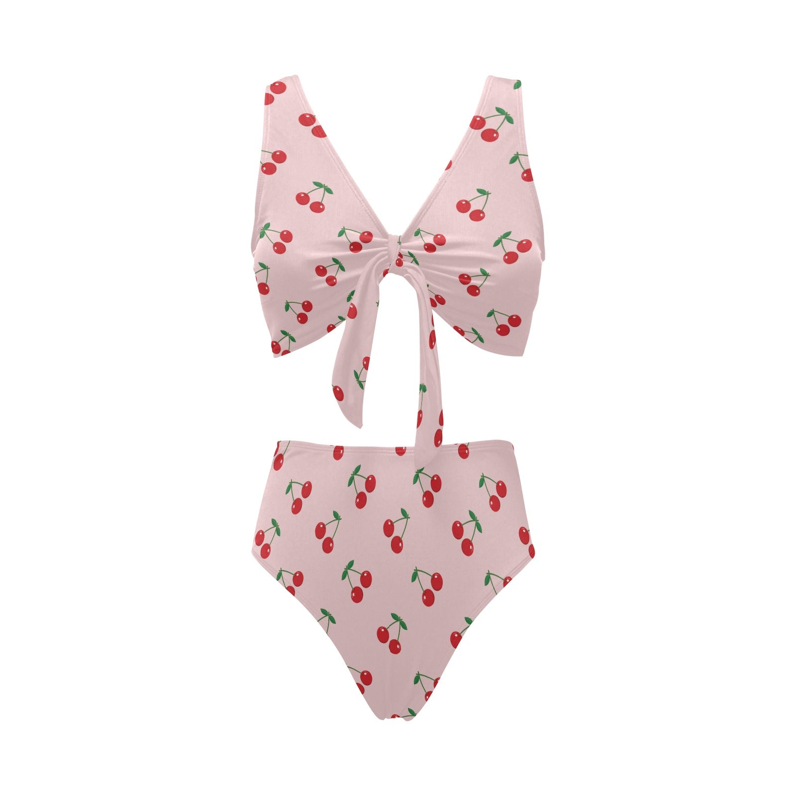 cherry pattern pink background Chest Bowknot High Waisted Bikini Swimsuit