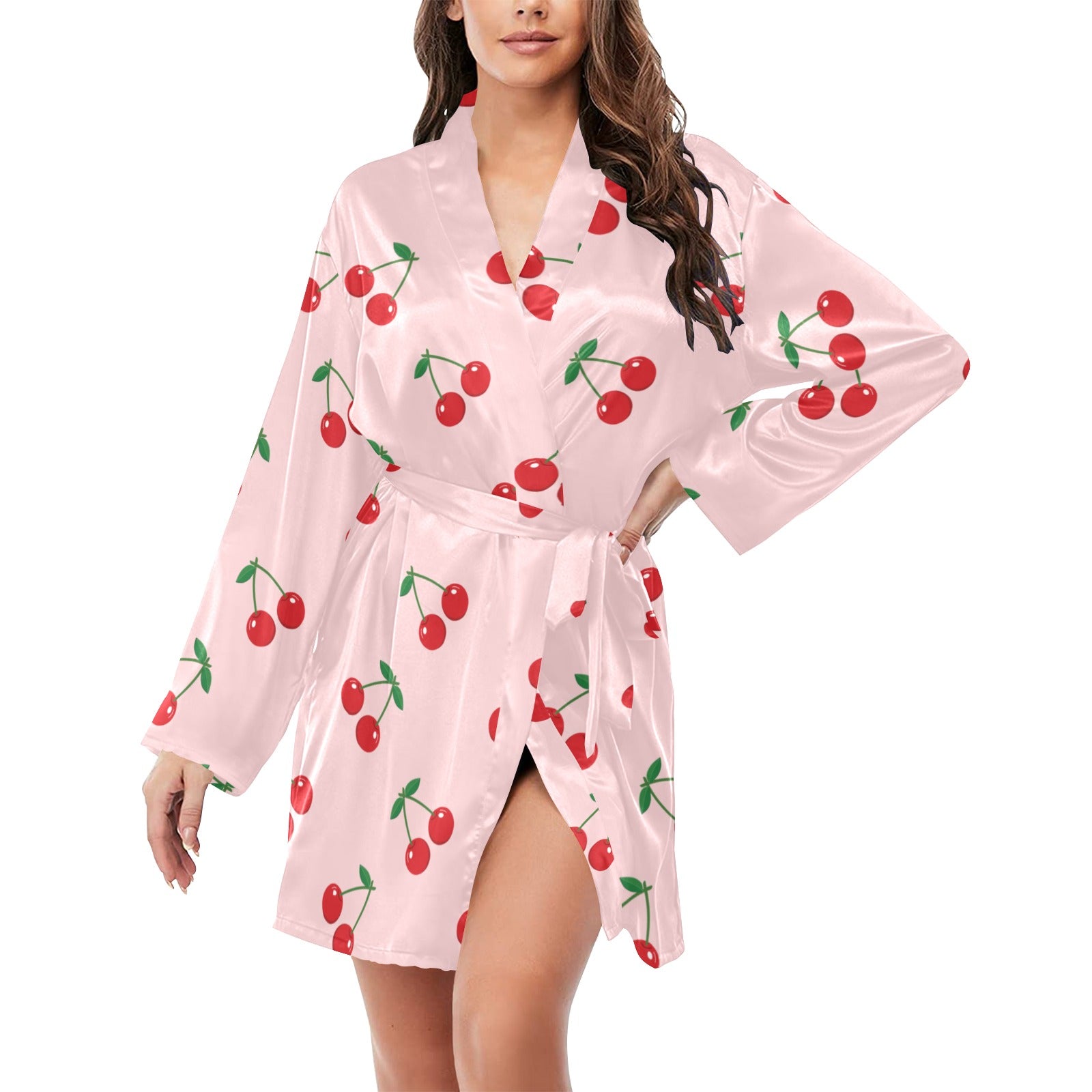 cherry pattern pink background Women's Long Sleeve Belted Night Robe