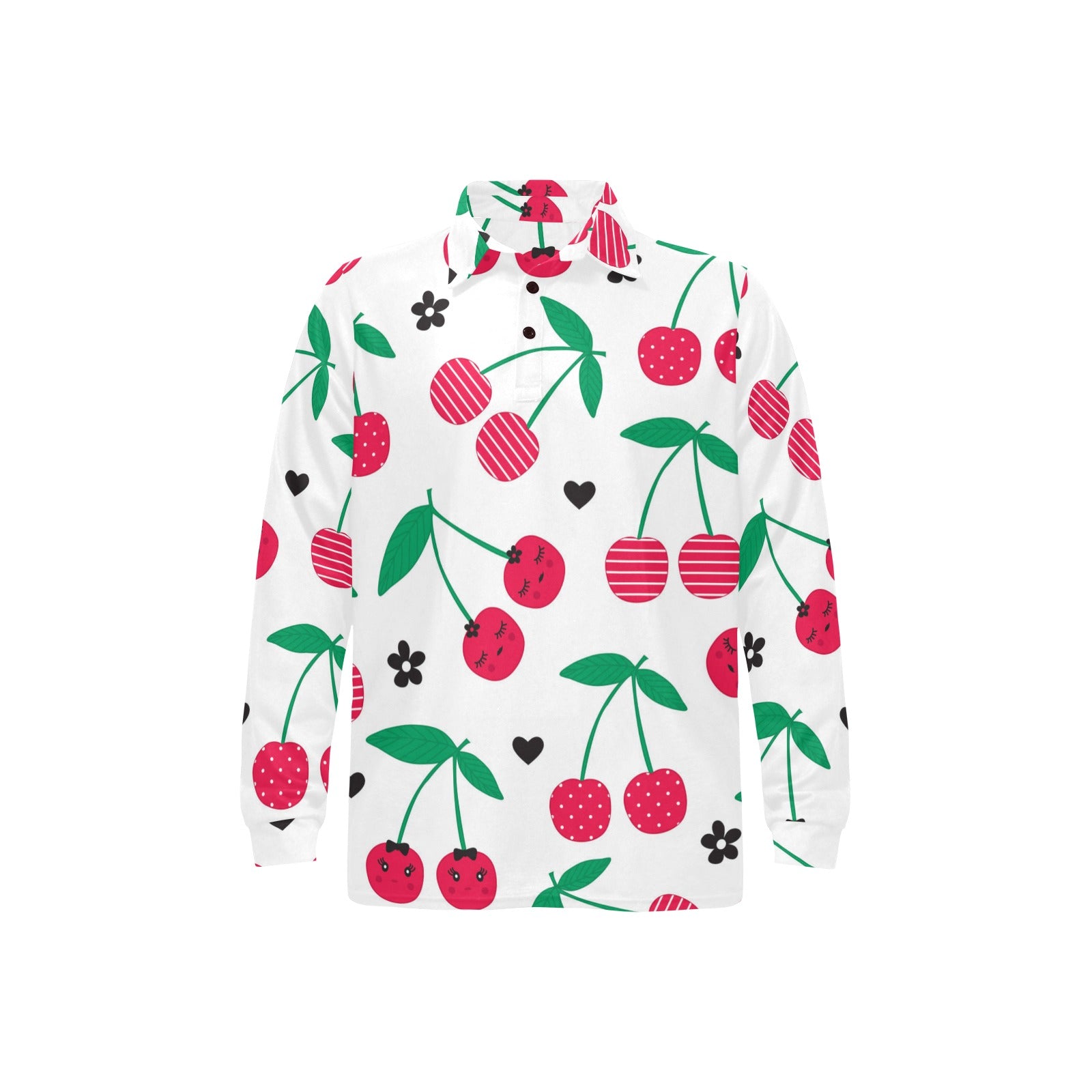 cherry pattern white background Men's Long Sleeve Polo Shirt