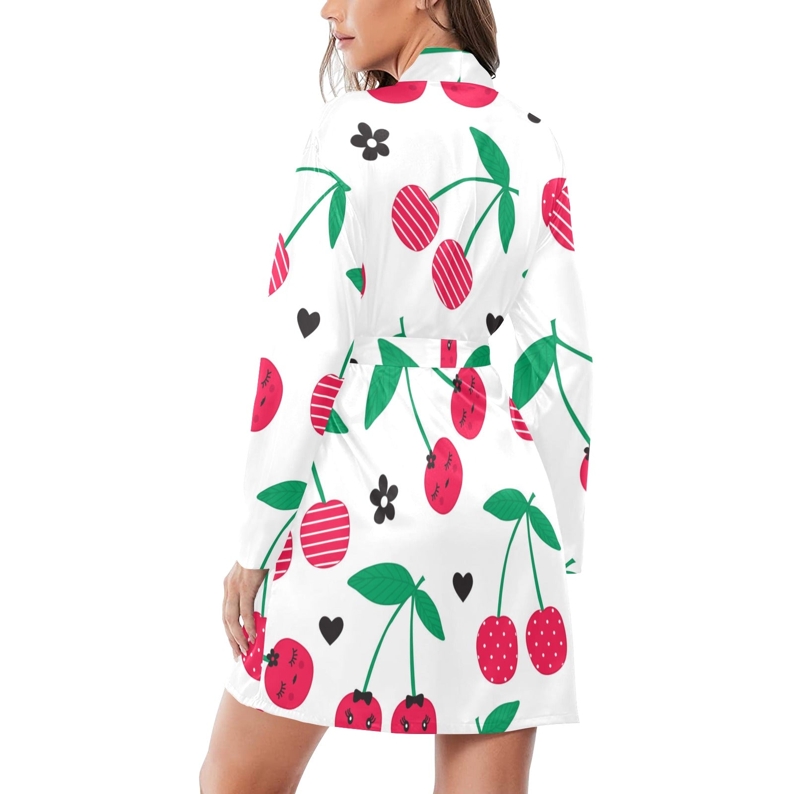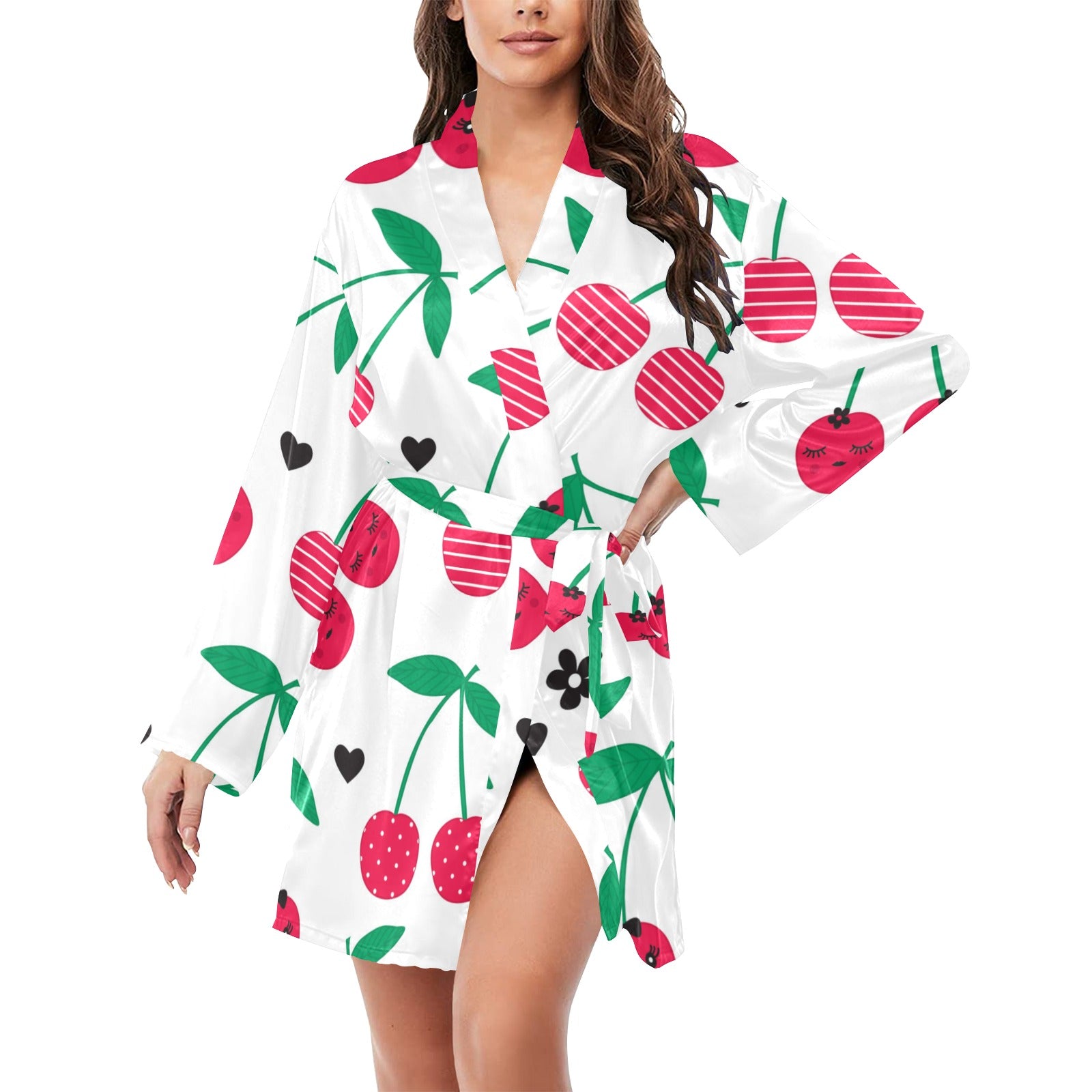 cherry pattern white background Women's Long Sleeve Belted Night Robe