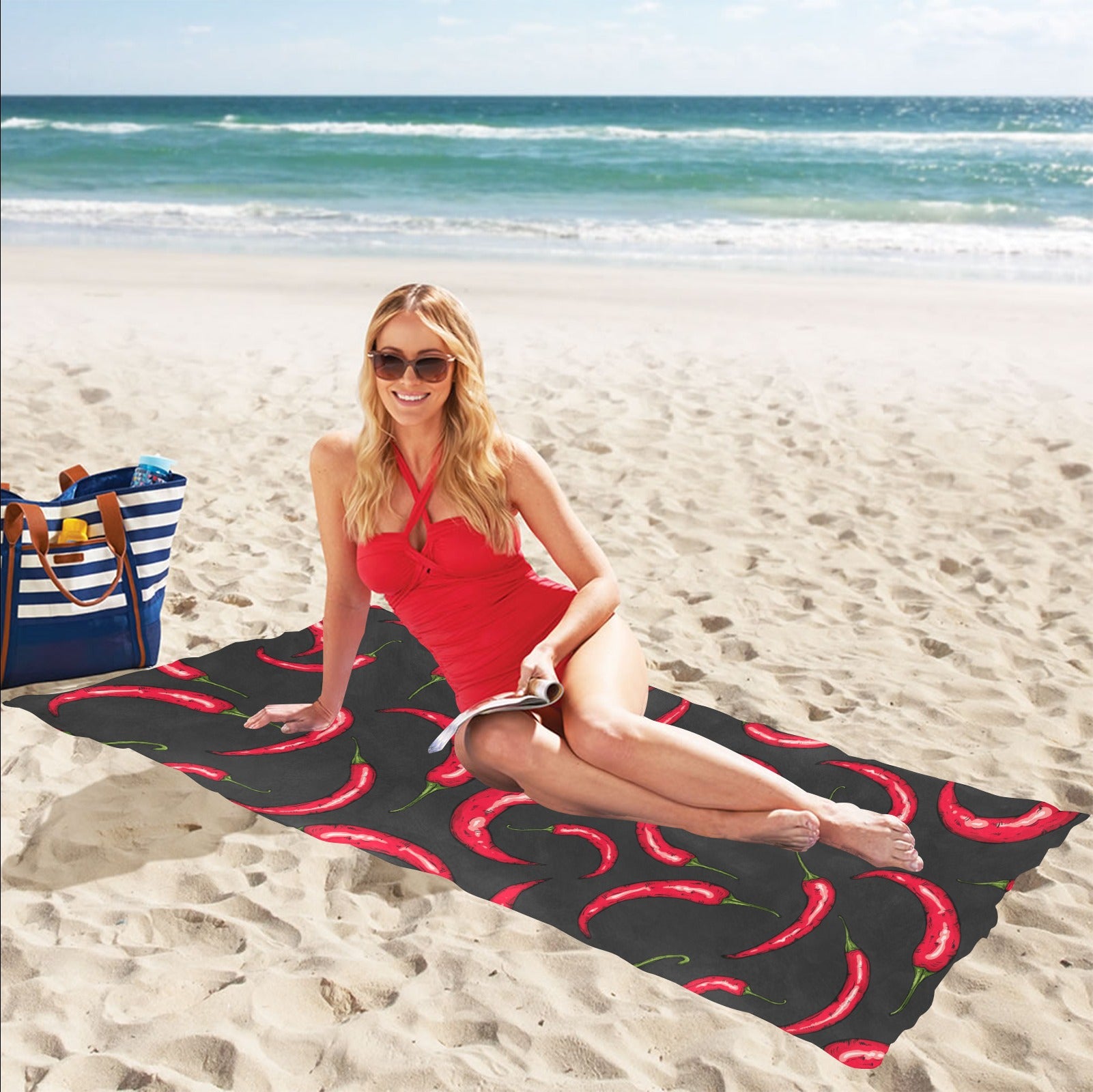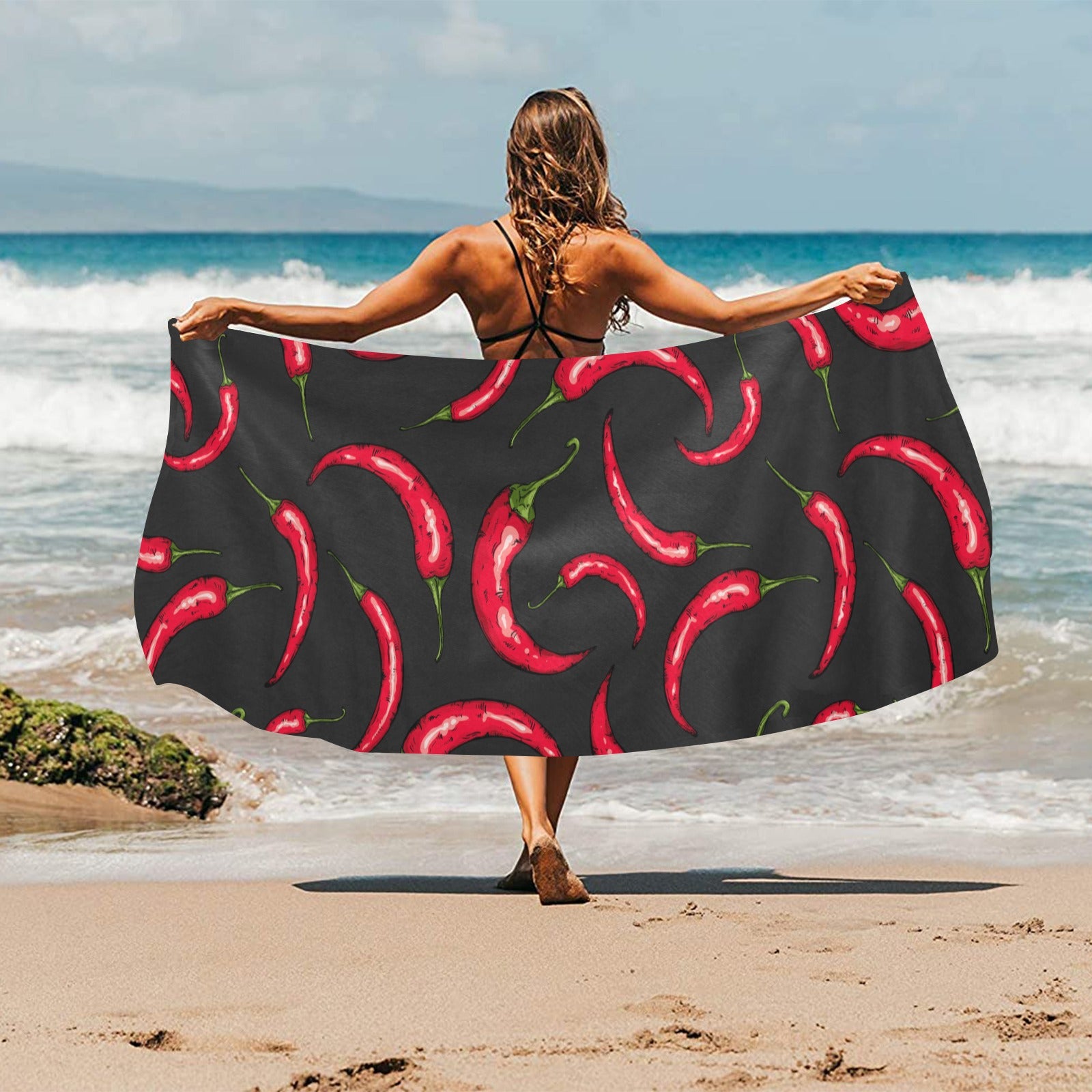Chili peppers pattern black background Beach Towel