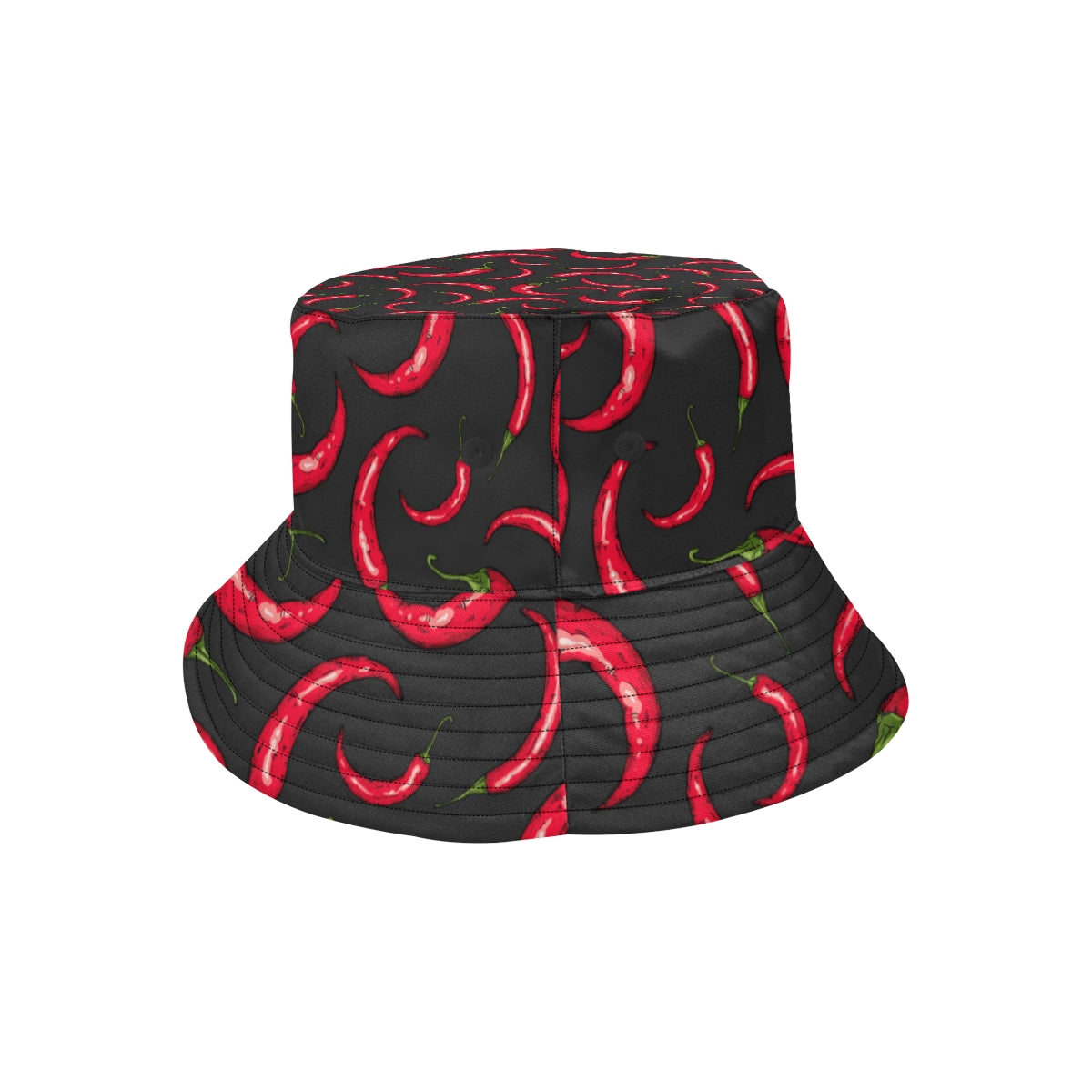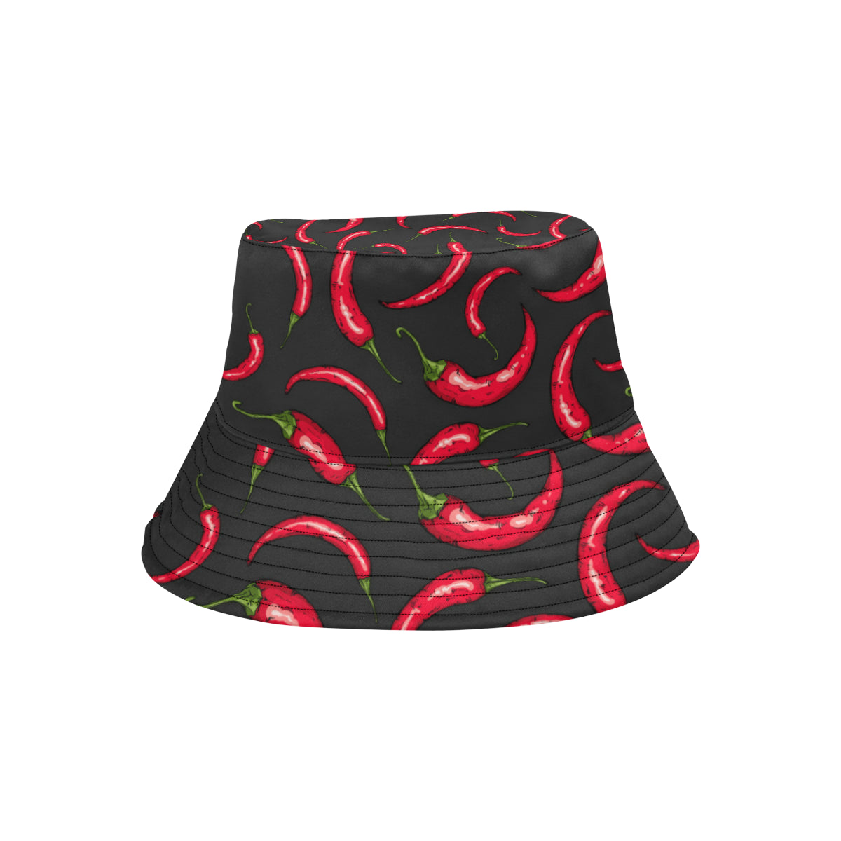 Chili peppers pattern black background Unisex Bucket Hat is a uniqued design and limited item. It made to order, hand printed, and sewn with love in our factory.