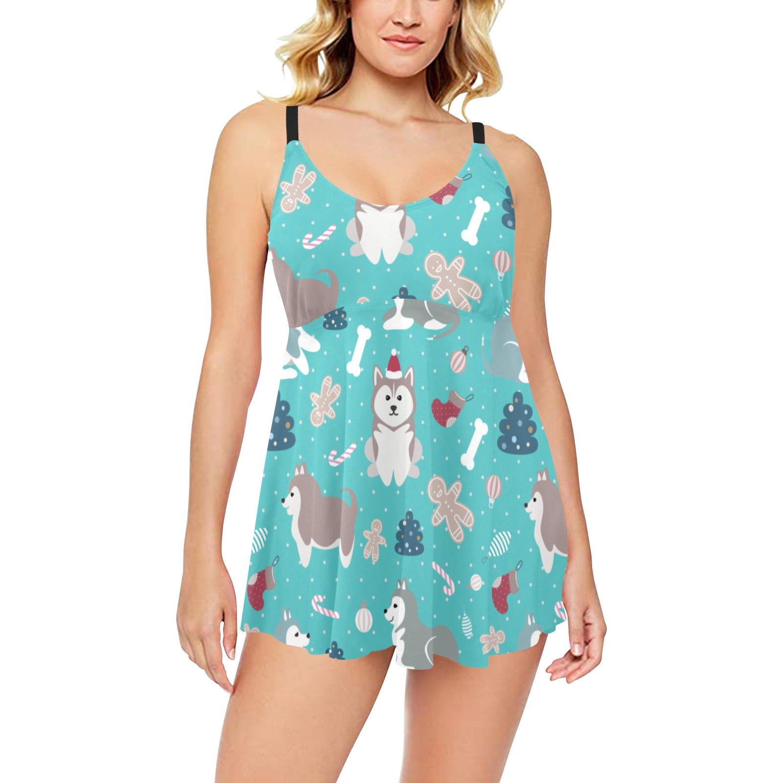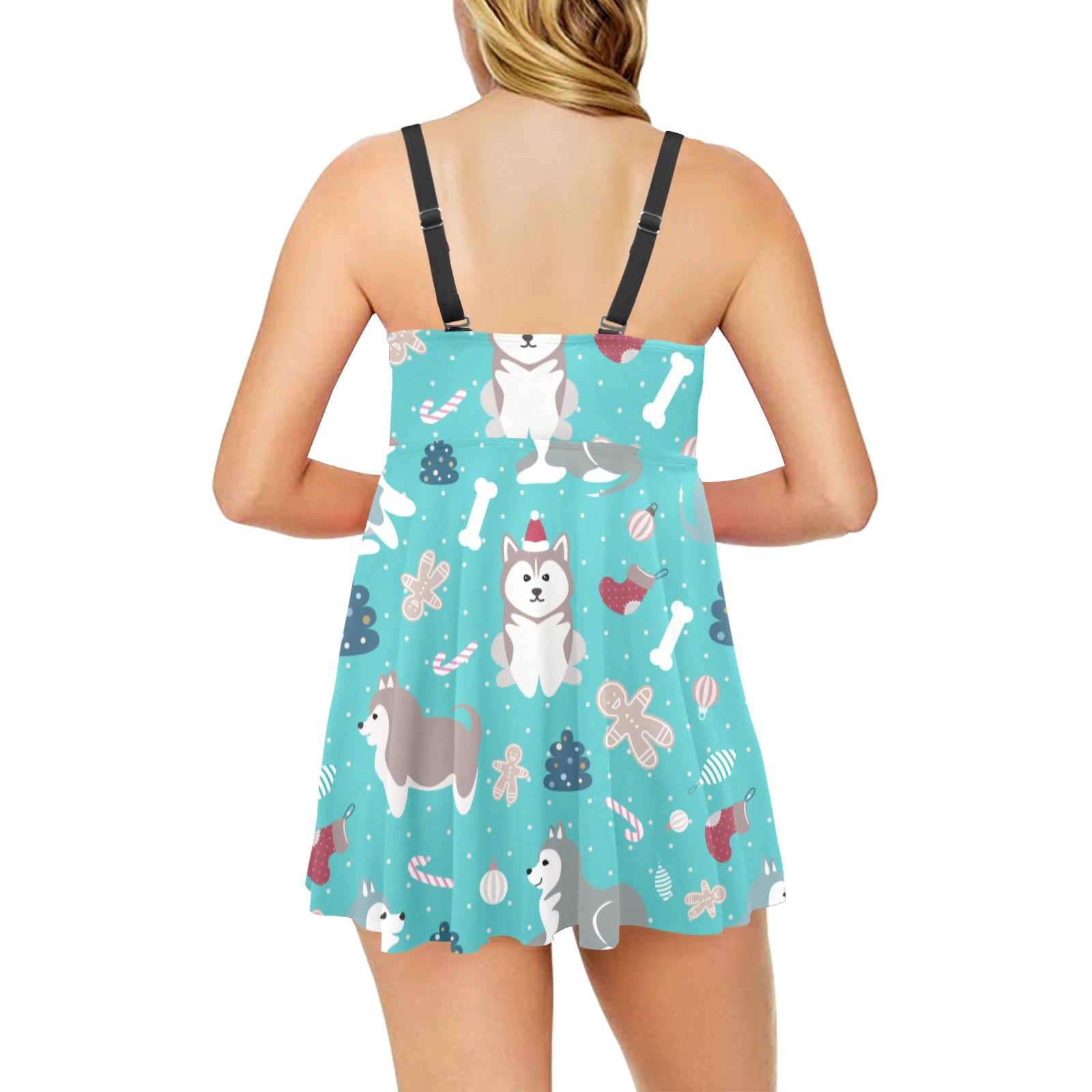 Christmas cute siberian husky puppie pattern Chest Sexy Pleated Two Piece Swim Dress
