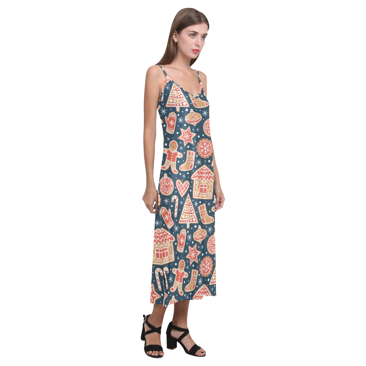 Christmas gingerbread cookie pattern V-Neck Open Fork Long Dress