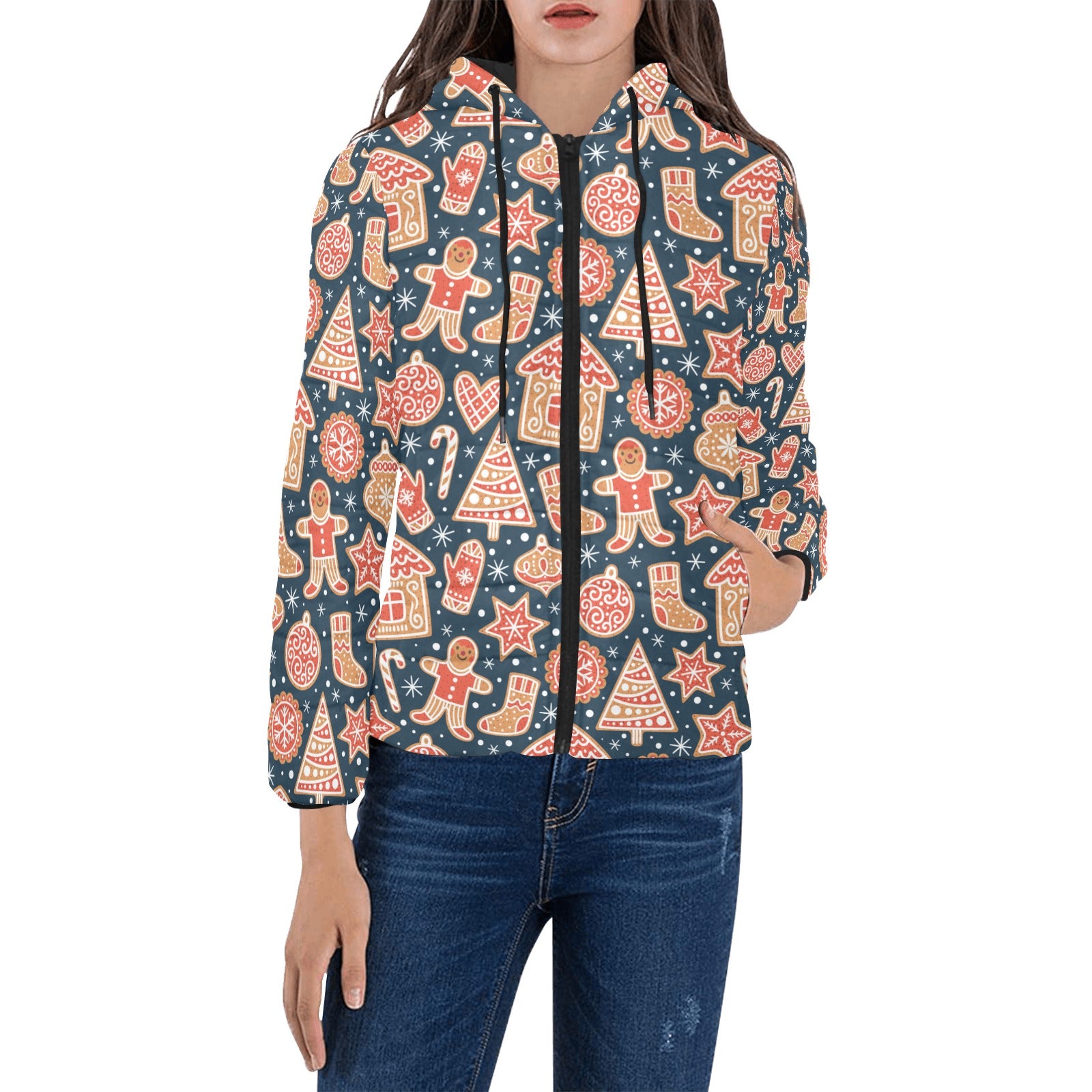 Christmas gingerbread cookie pattern Women's Padded Hooded Jacket