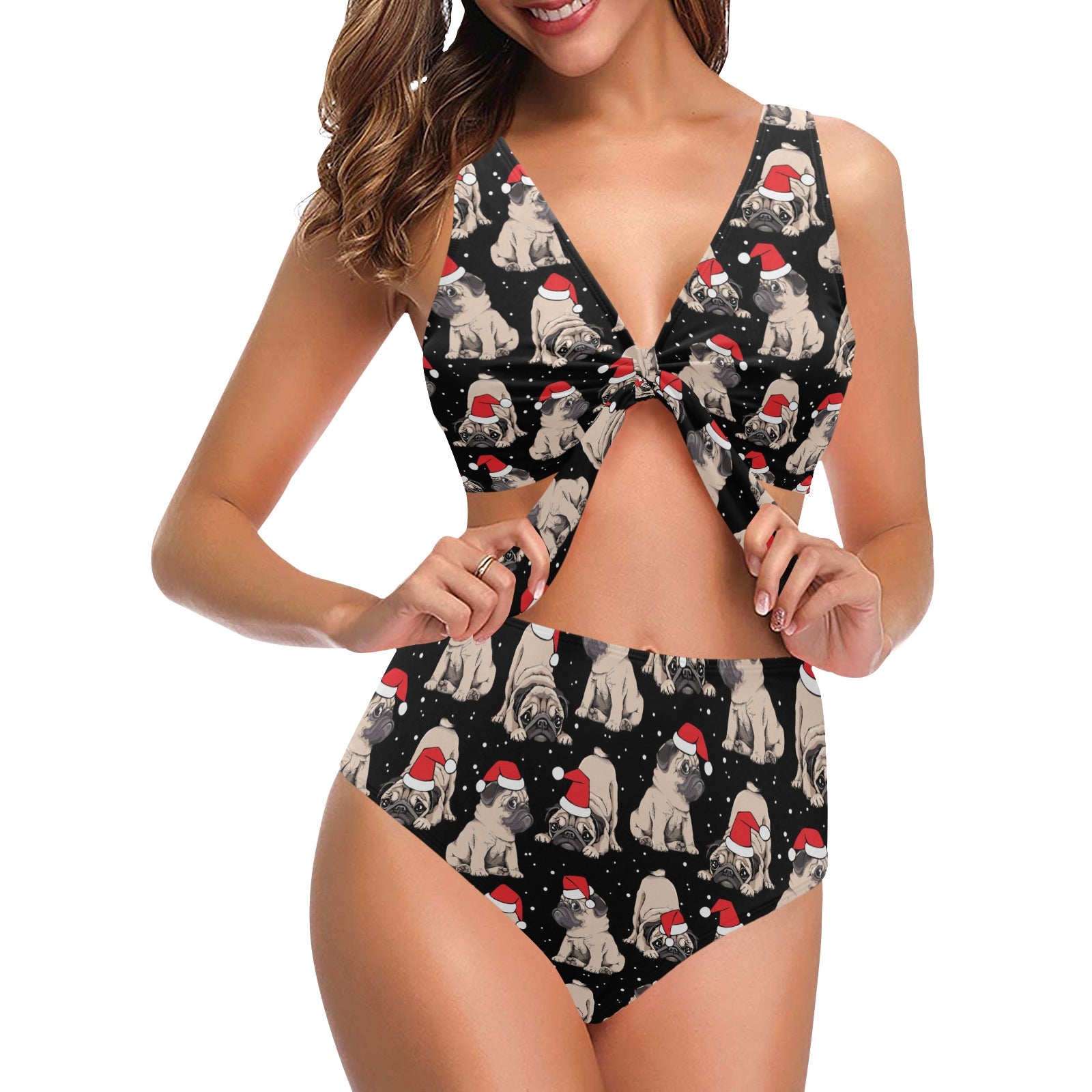 Christmas Pugs Santa_s red cap pattern Chest Bowknot High Waisted Bikini Swimsuit