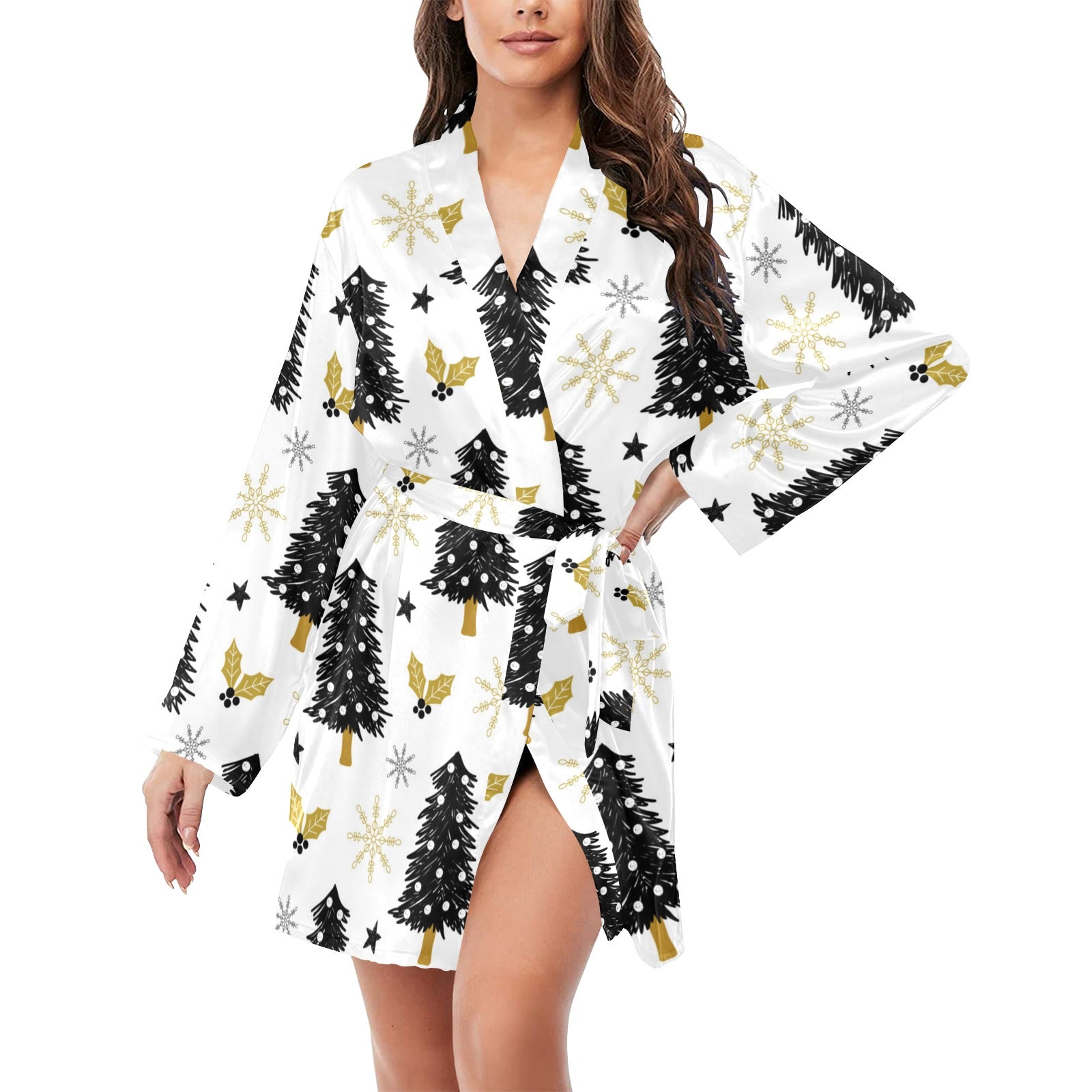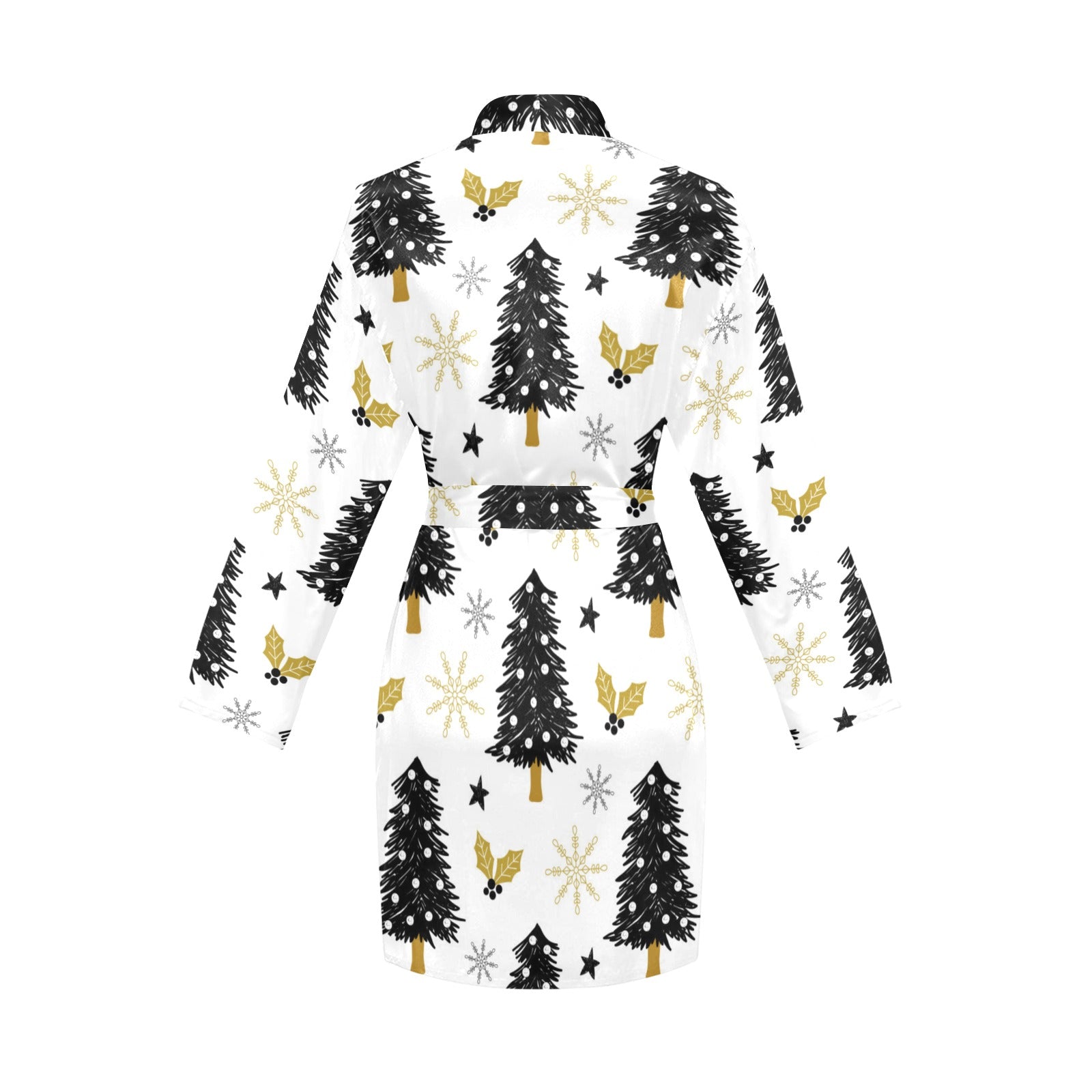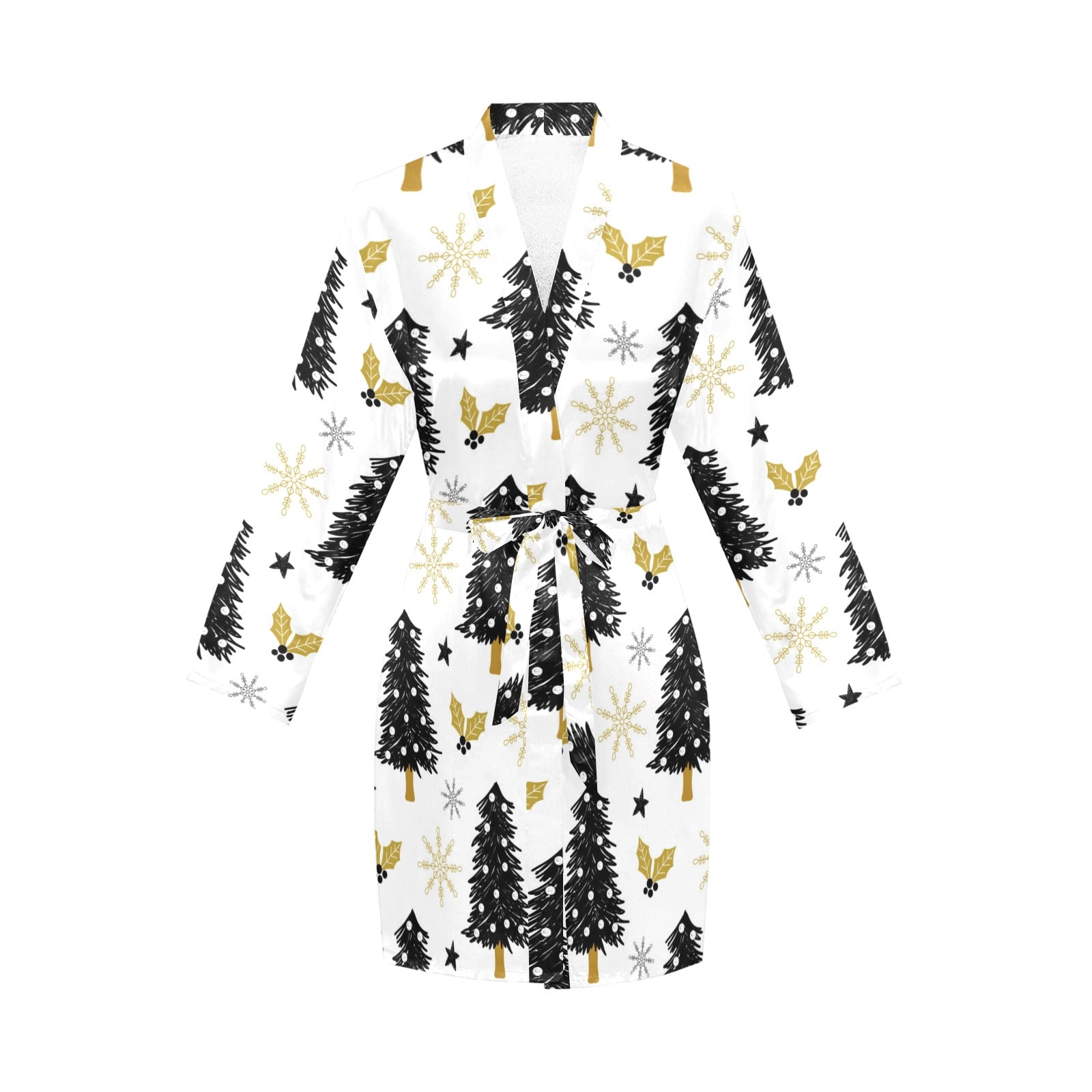 Christmas tree holly snow star pattern Women's Long Sleeve Belted Night Robe