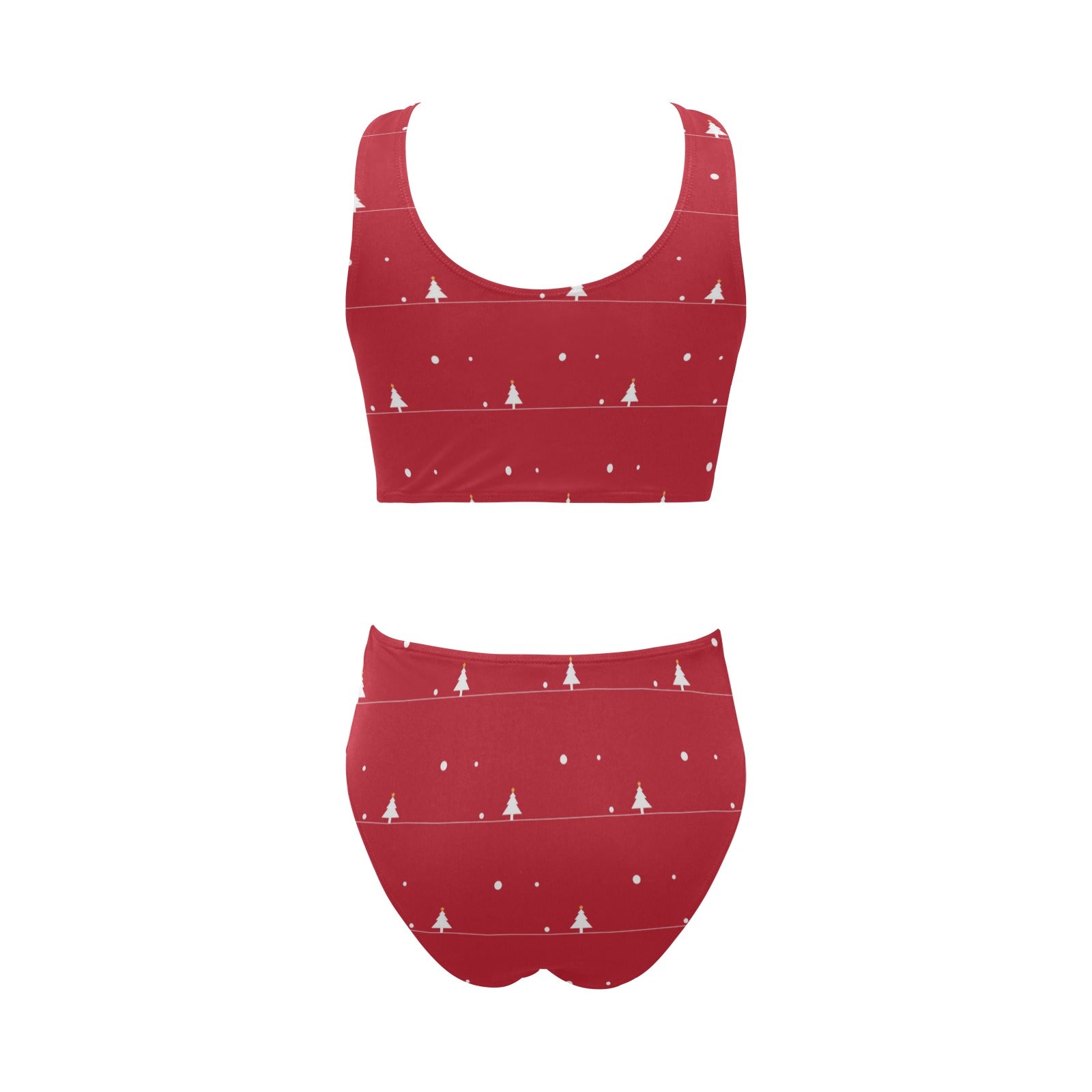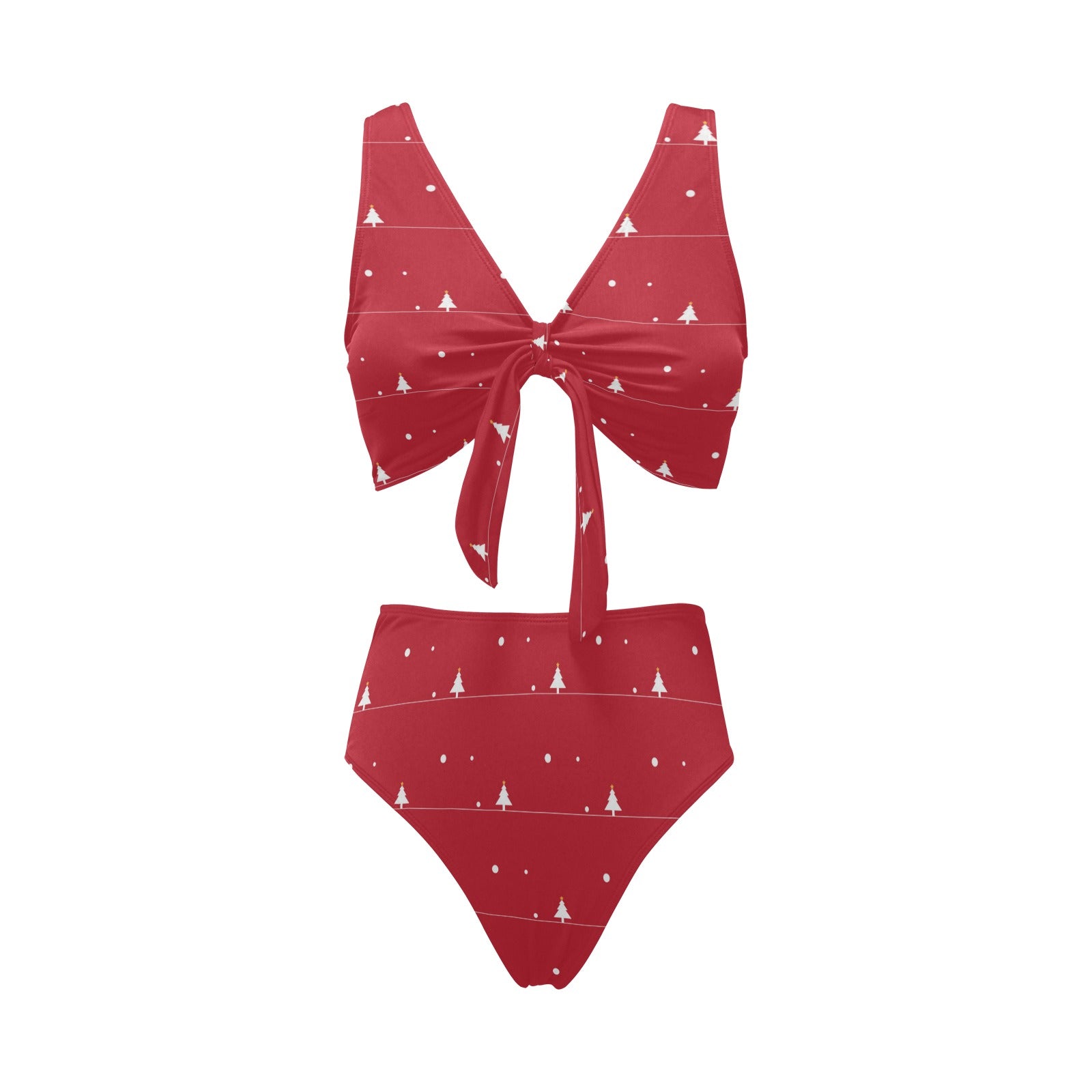 Christmas tree star snow red background Chest Bowknot High Waisted Bikini Swimsuit