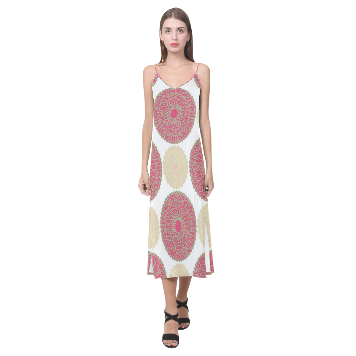 Circle indian pattern V-Neck Open Fork Long Dress is a uniqued design and limited item. It made to order, hand printed, and sewn with love in our factory.