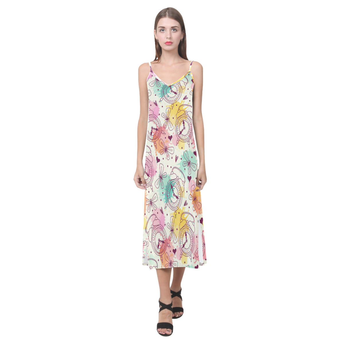 Clock butterfly pattern V-Neck Open Fork Long Dress is a uniqued design and limited item. It made to order, hand printed, and sewn with love in our factory.