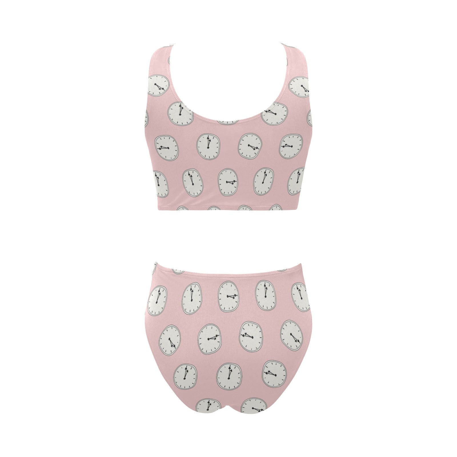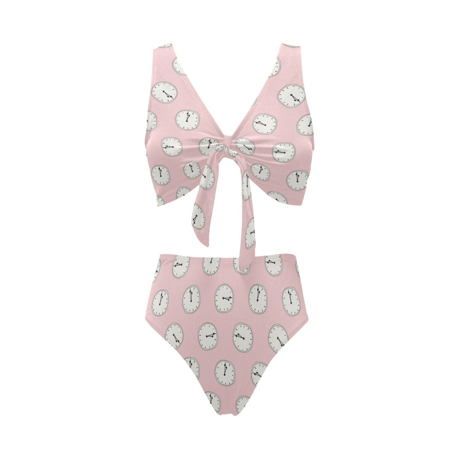 Clock pattern pink blackground Chest Bowknot High Waisted Bikini Swimsuit