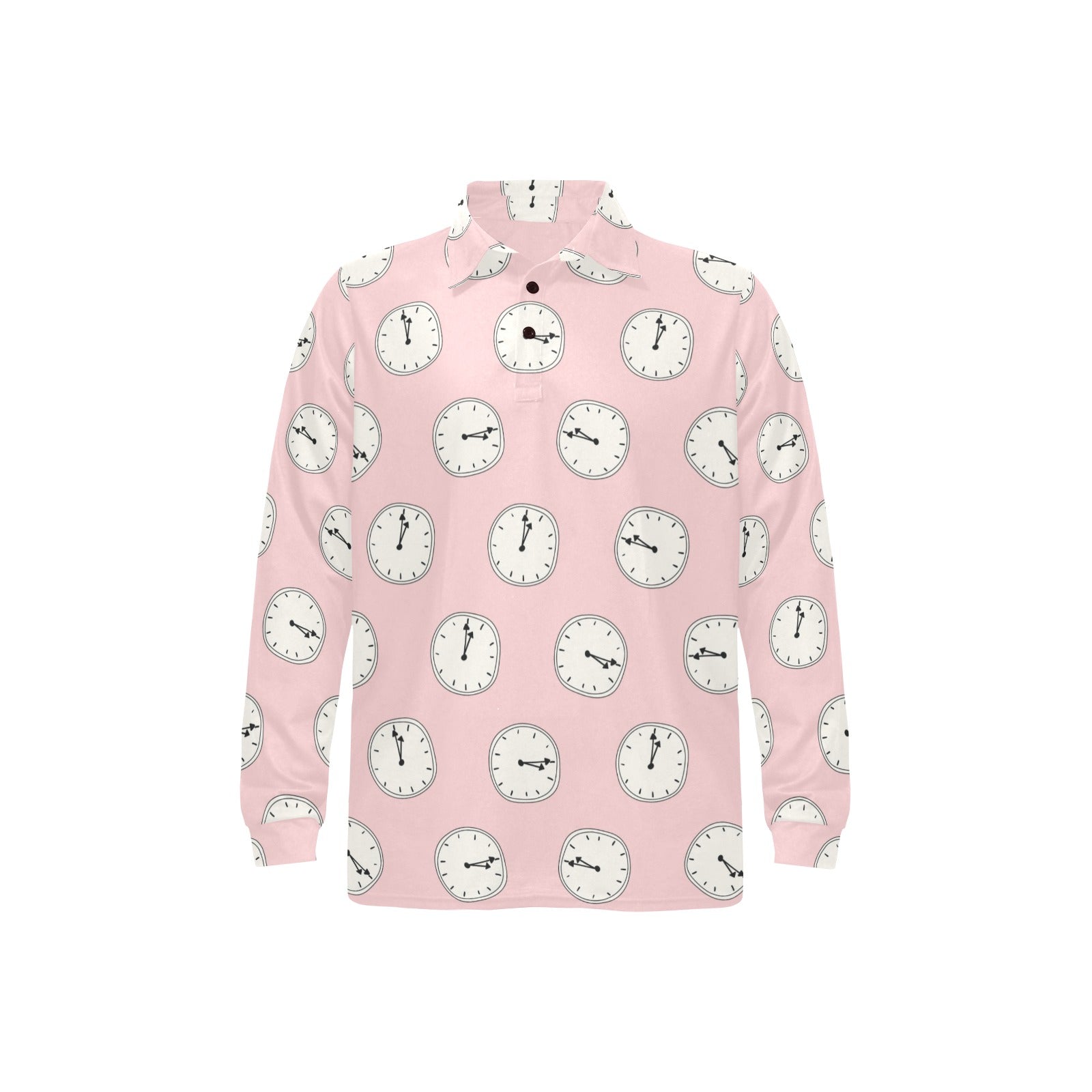 Clock pattern pink blackground Men's Long Sleeve Polo Shirt