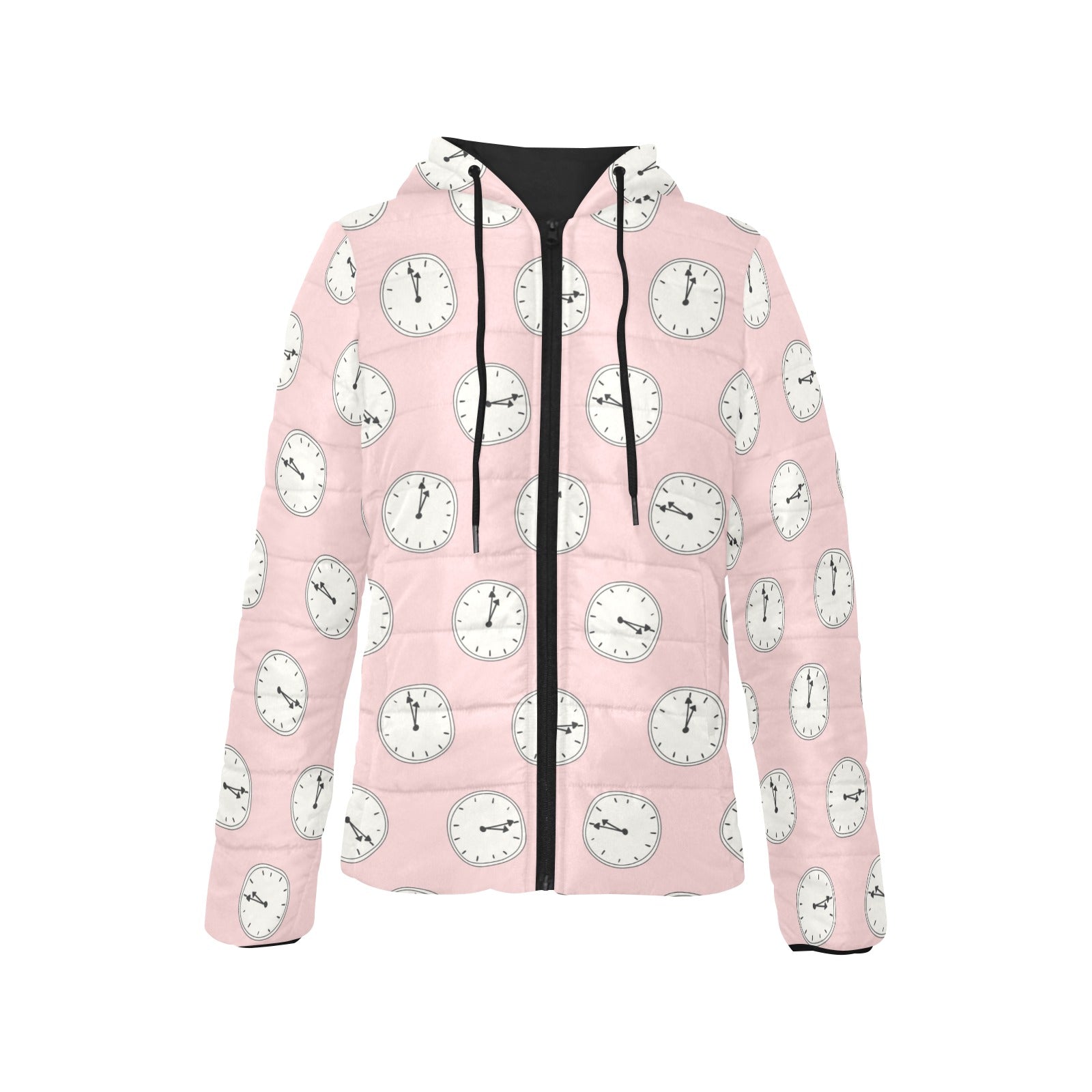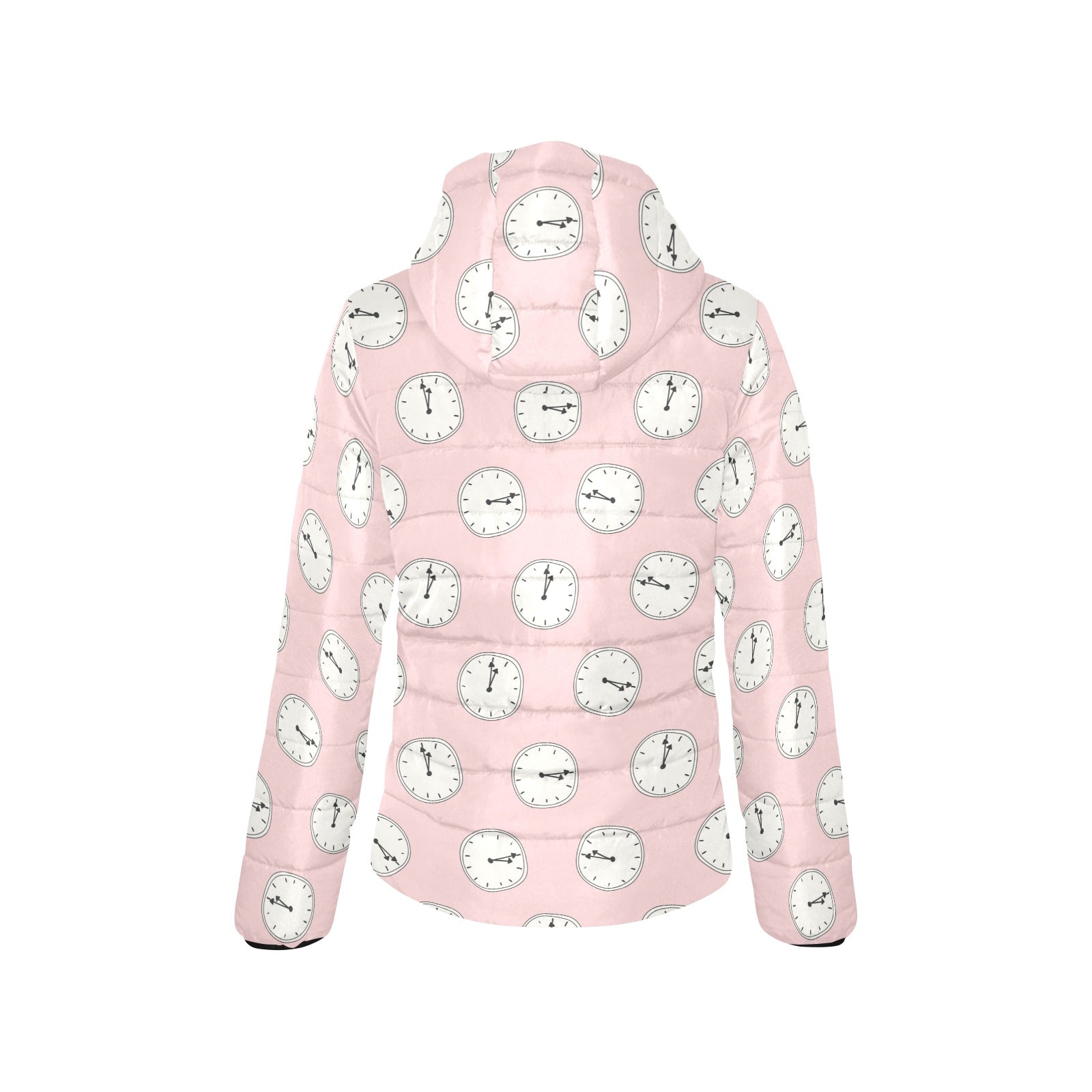 Clock pattern pink blackground Women's Padded Hooded Jacket