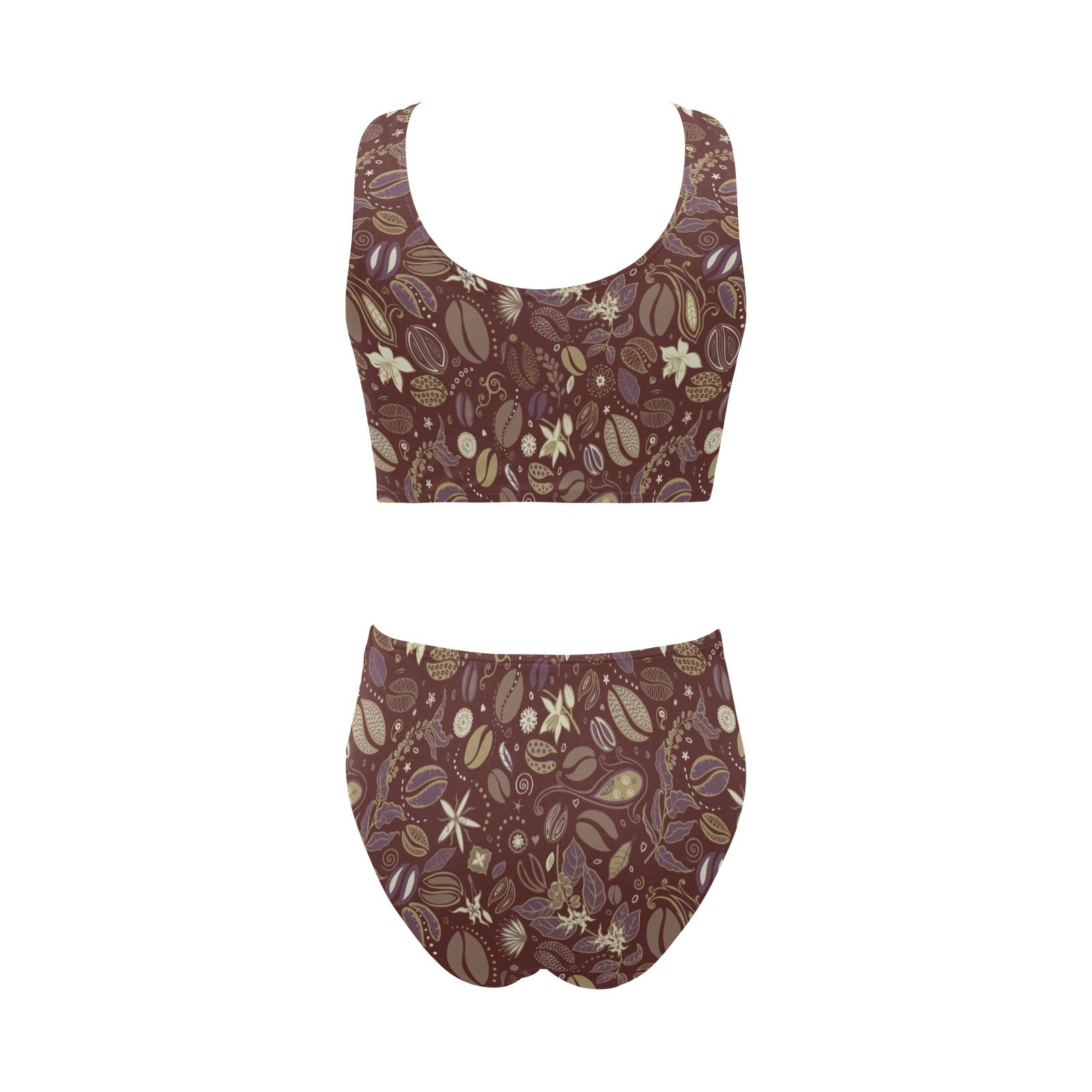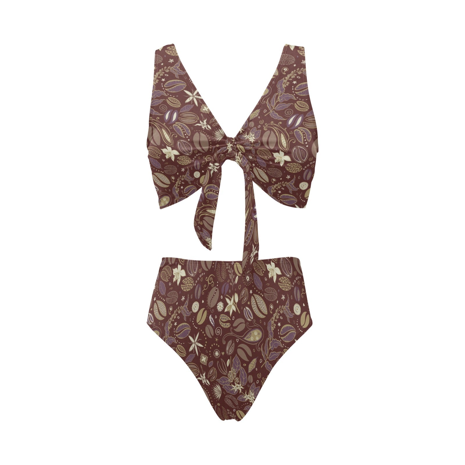 Coffee bean flower pattern Chest Bowknot High Waisted Bikini Swimsuit