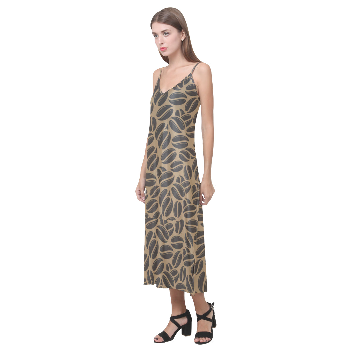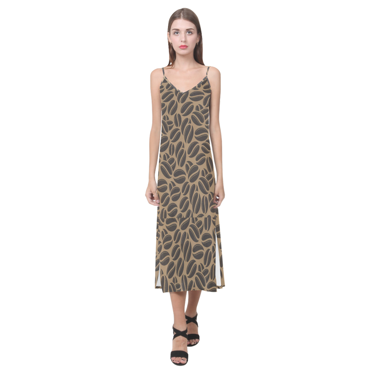 Coffee bean on brown background V-Neck Open Fork Long Dress is a uniqued design and limited item. It made to order, hand printed, and sewn with love in our factory.