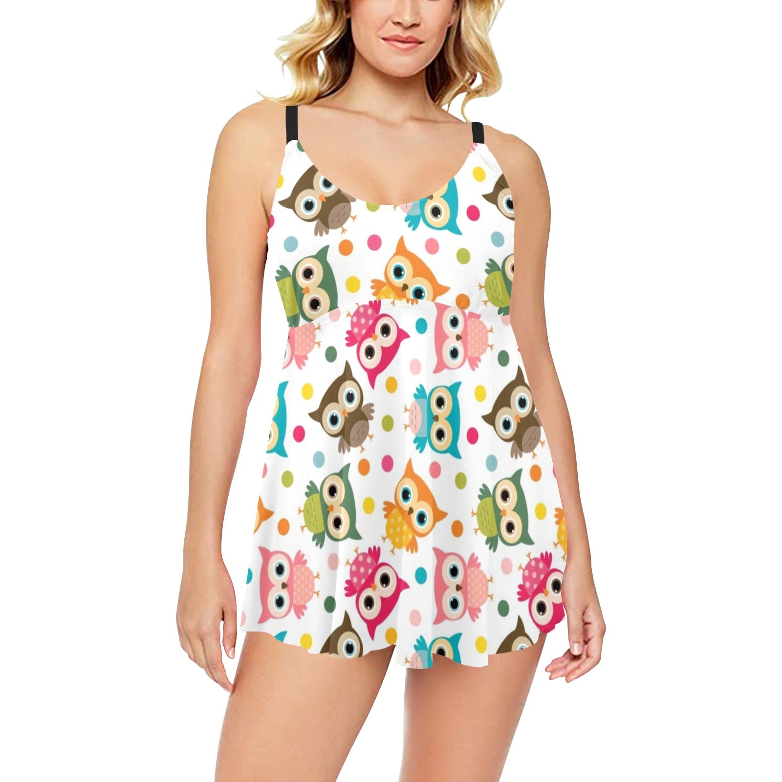 Color cute owl pattern Chest Sexy Pleated Two Piece Swim Dress