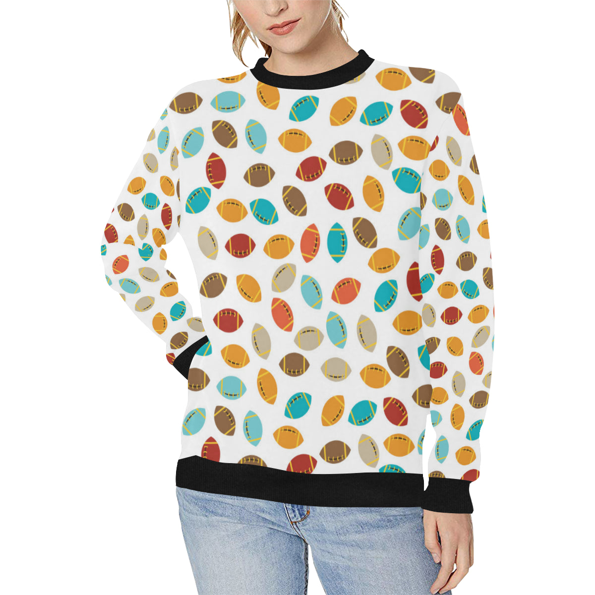 Colorful american football ball pattern Women's Crew Neck Sweatshirt is a uniqued design and limited item. It made to order, hand printed, and sewn with love in our factory.